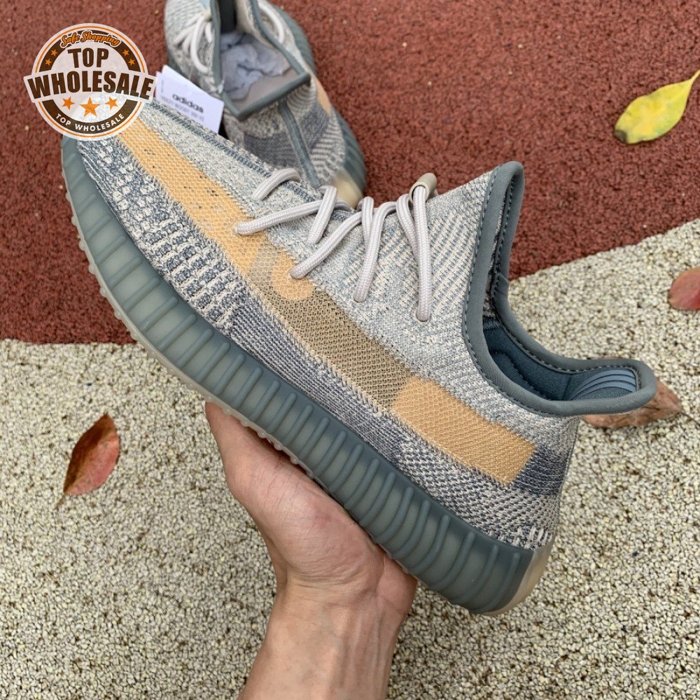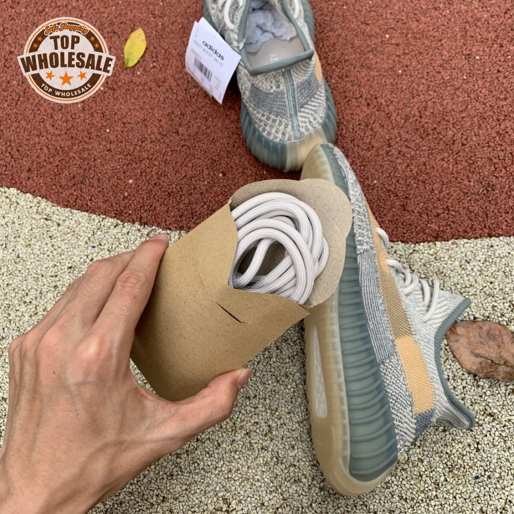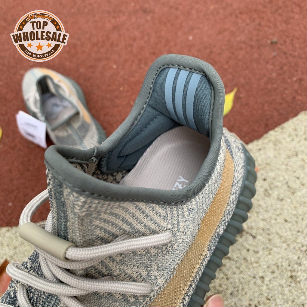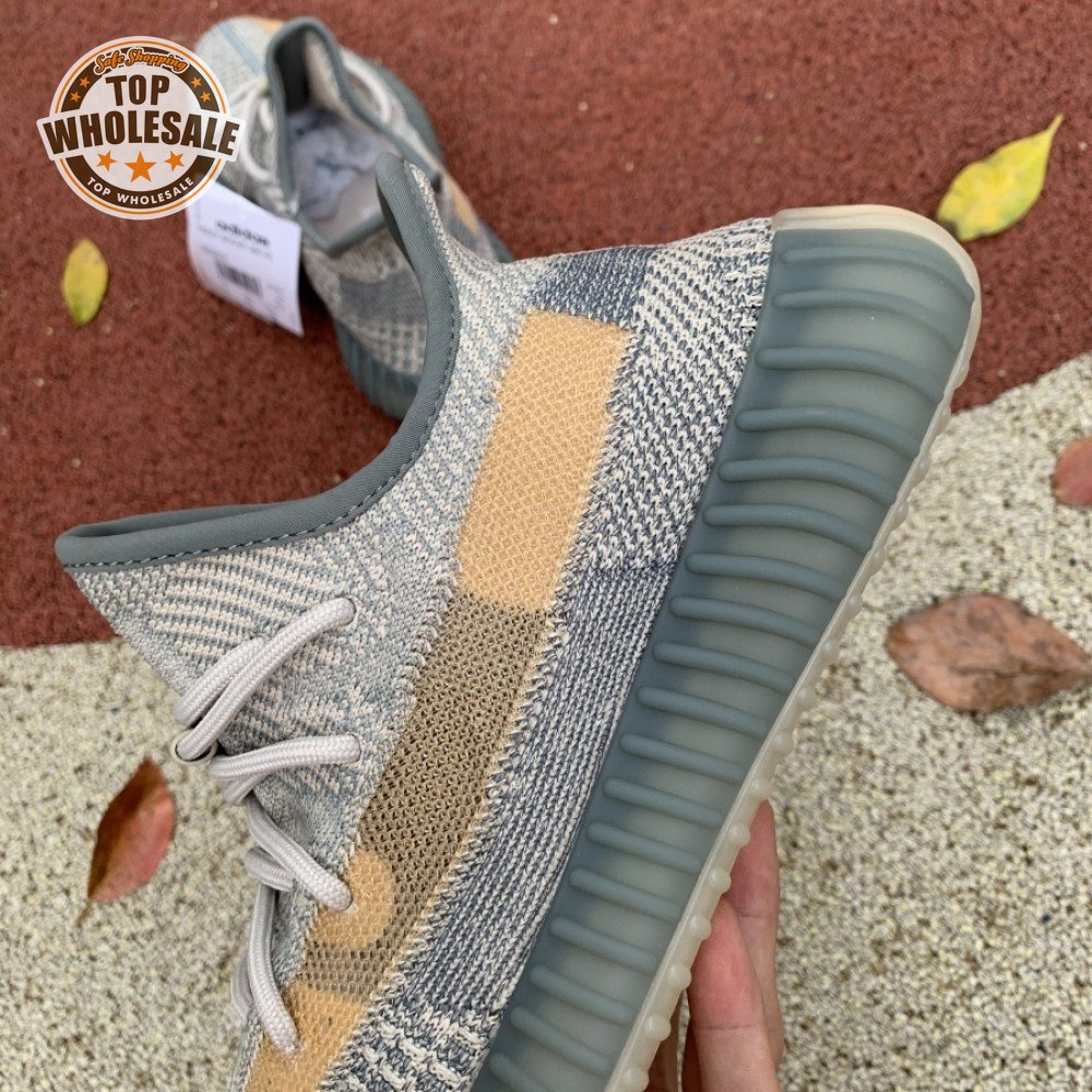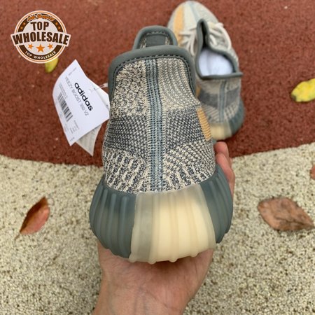 The adidas Yeezy Boost 350 V2 "Israfil" features a patchwork-like composition on the Primeknit upper, constructed from a two-tone blend of tan and grey yarns. The neutral hues are enlivened by a streak of yellow on the signature post-dyed monofilament side stripe. Responsive cushioning comes courtesy of the standard full-length Boost midsole, encased in a semi-translucent rubber sidewall. A grippy gum rubber outsole provides durable traction underfoot.