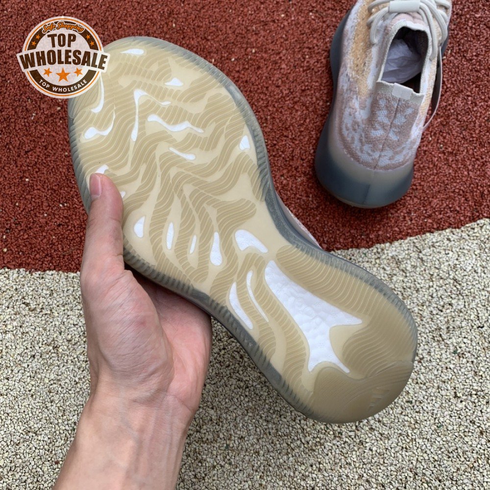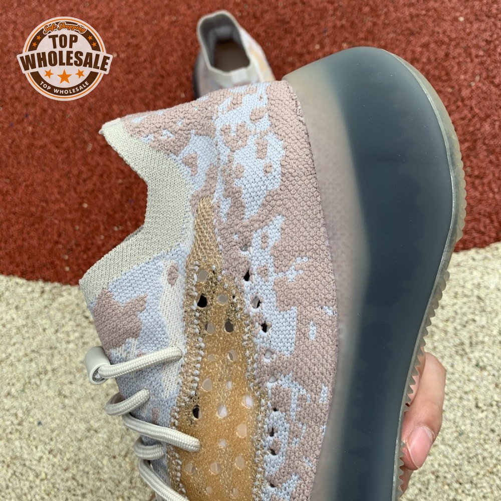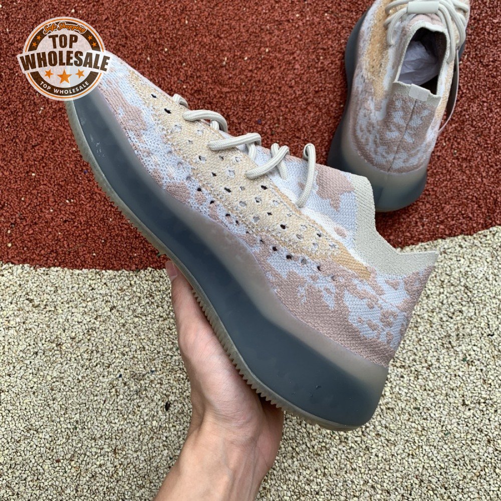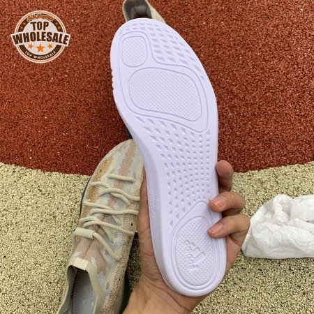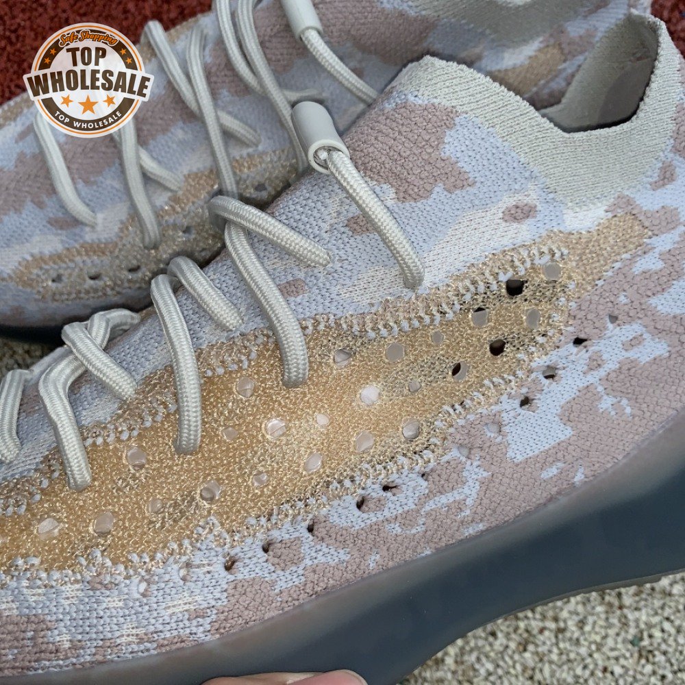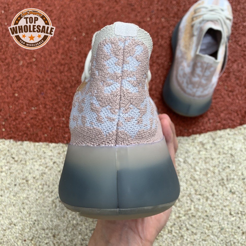 The adidas Yeezy Boost 380 "Pepper Reflective" offers sock-like comfort on the upper, crafted from subtly patterned Primeknit in a blend of light grey and beige hues. Reflective fibers are woven into the mix, offering enhanced visibility in low-light conditions. A coppery finish distinguishes the post-dyed monofilament side stripe, adding a see-through element to the minimalist build. A greyish-blue rubber cage envelops the full-length Boost midsole.