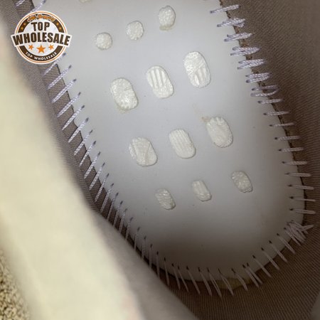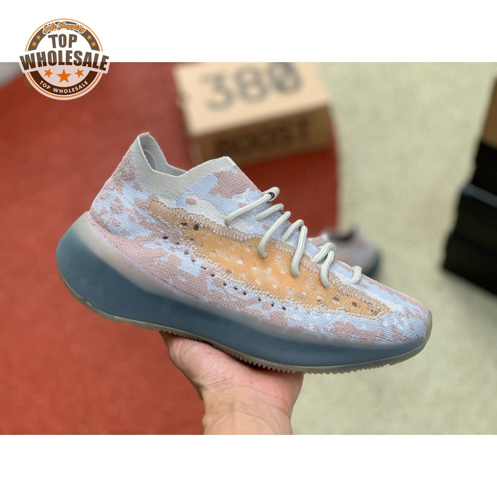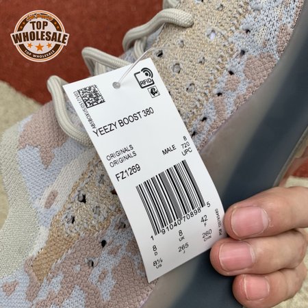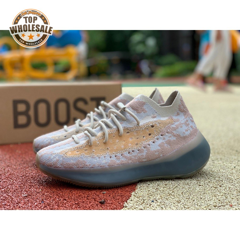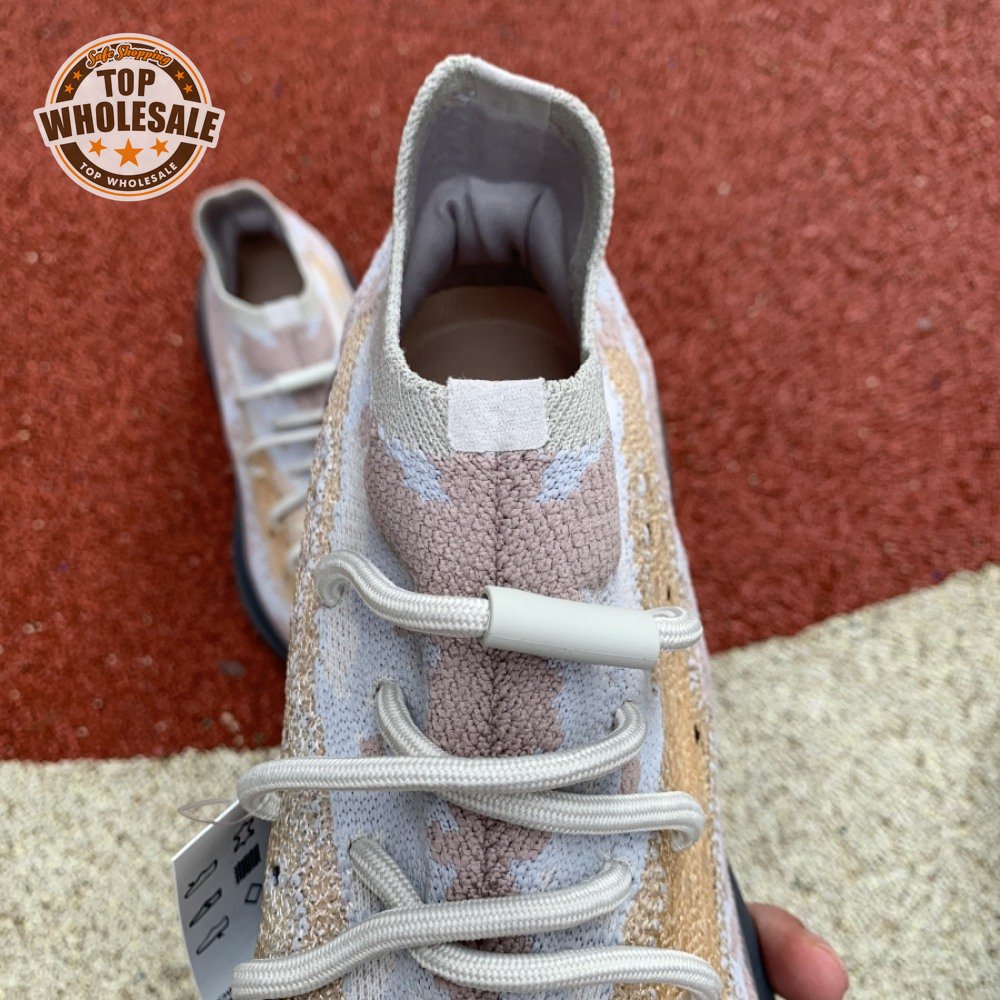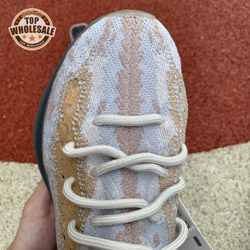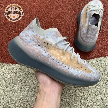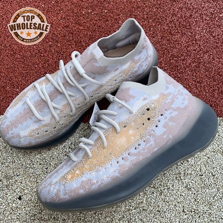 The adidas Yeezy Boost 380 "Pepper Reflective" offers sock-like comfort on the upper, crafted from subtly patterned Primeknit in a blend of light grey and beige hues. Reflective fibers are woven into the mix, offering enhanced visibility in low-light conditions. A coppery finish distinguishes the post-dyed monofilament side stripe, adding a see-through element to the minimalist build. A greyish-blue rubber cage envelops the full-length Boost midsole.