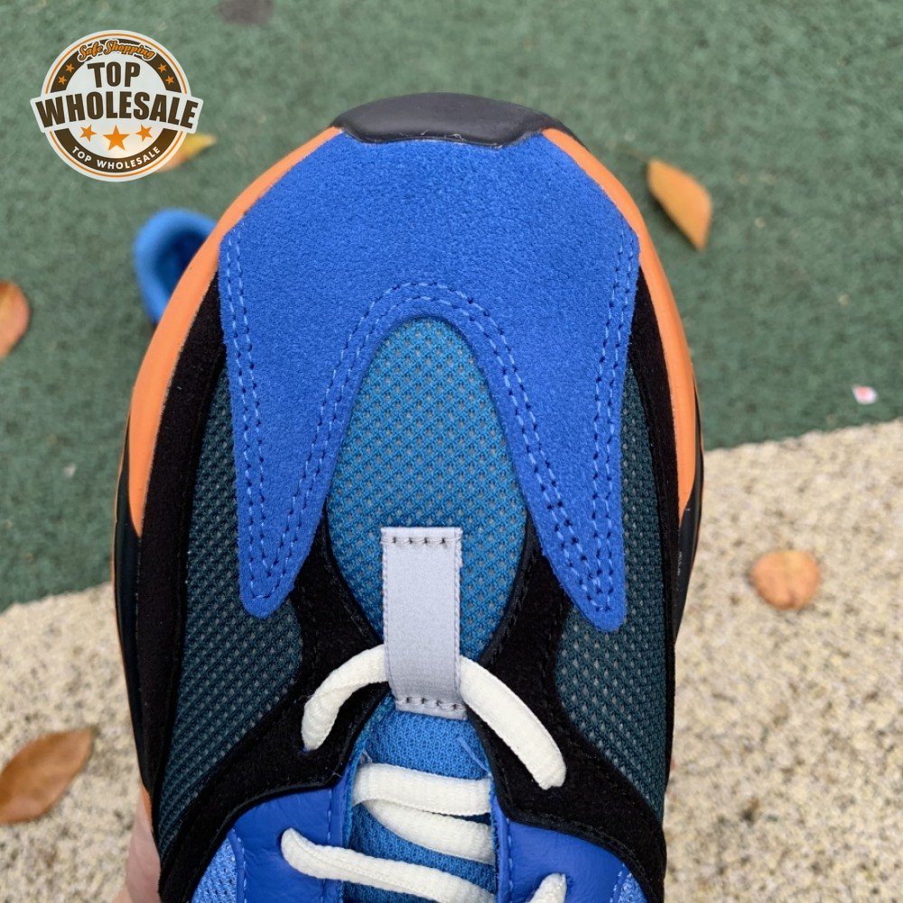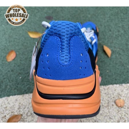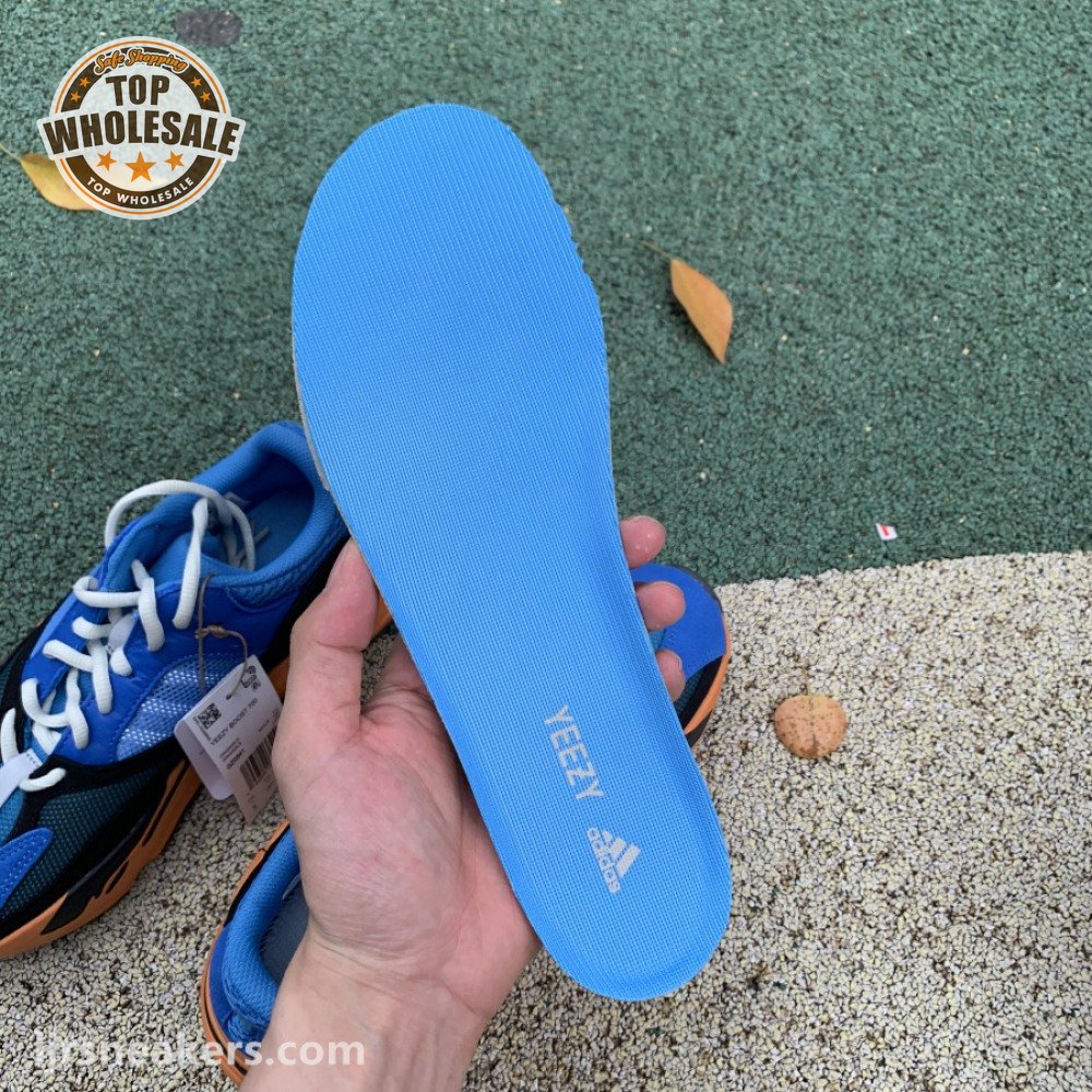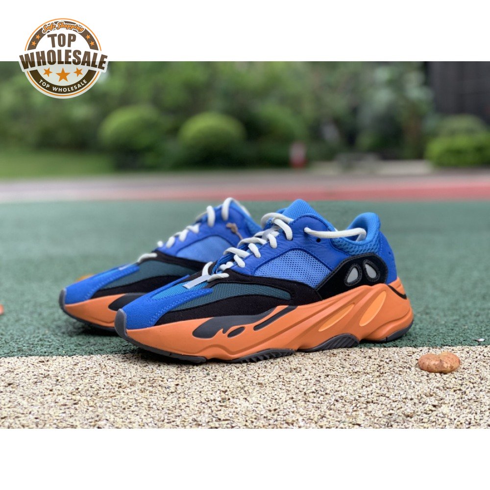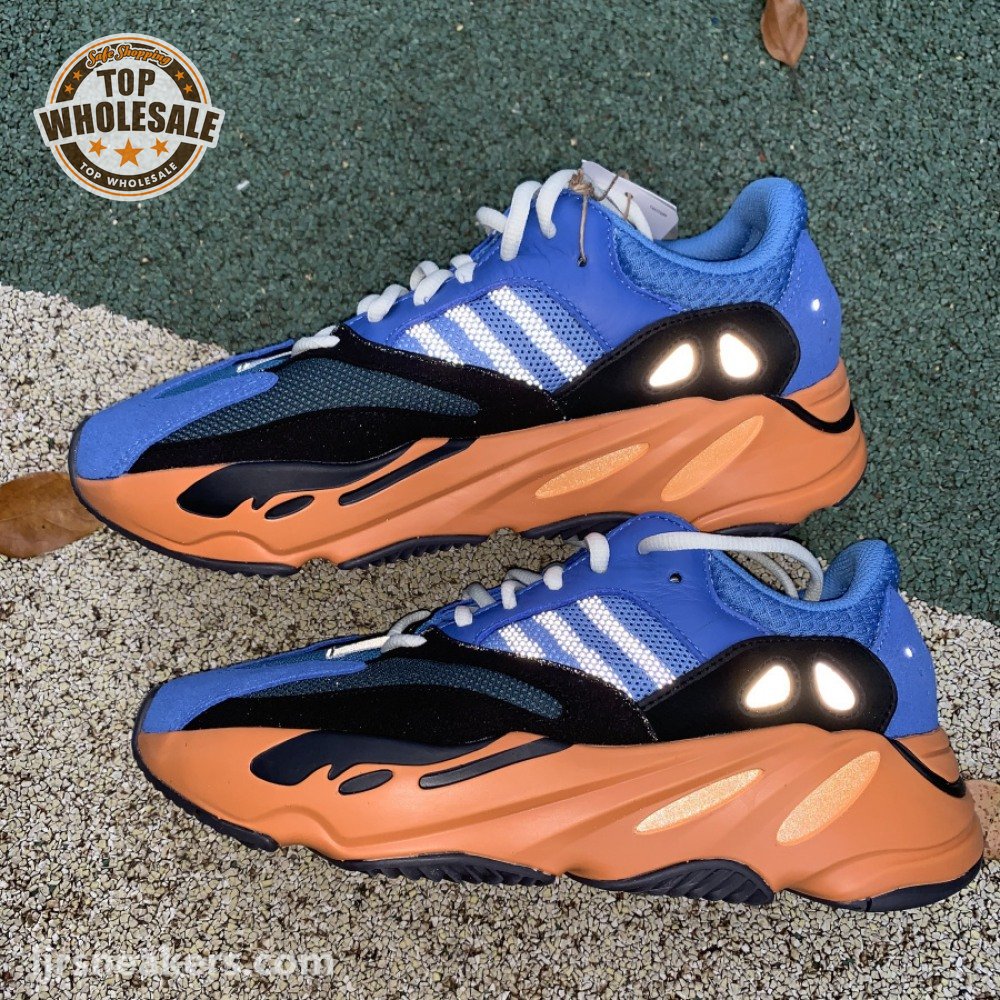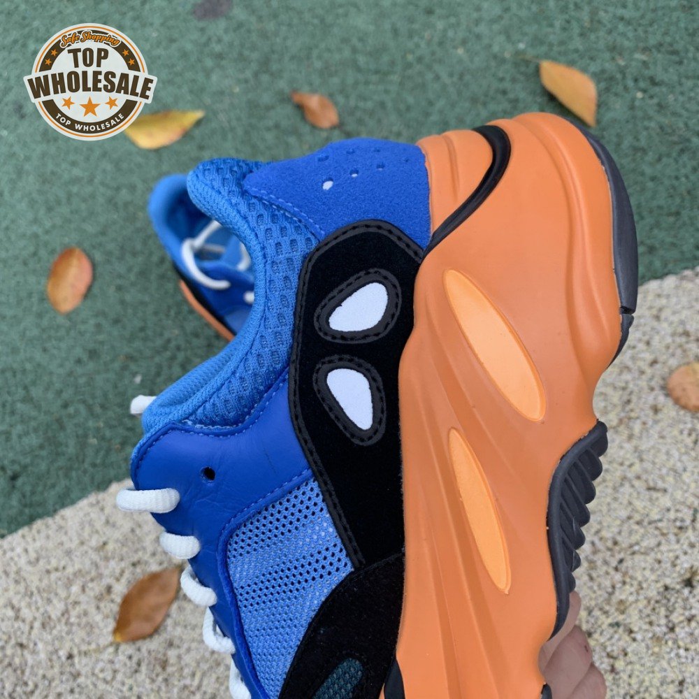 The adidas Yeezy Boost 700 "Bright Blue" uses sharply contrasting finishes to delineate the lifestyle runner"s upper and tooling. The latter pairs sculpted orange sidewalls with a contrasting black rubber outsole, featuring a herringbone traction pattern with cut-out detailing that reveals a drop-in Boost midsole. Up top, royal blue mesh is reinforced with tonal suede overlays at the toe and heel, along with black suede midfoot panels enlivened with reflective detailing.