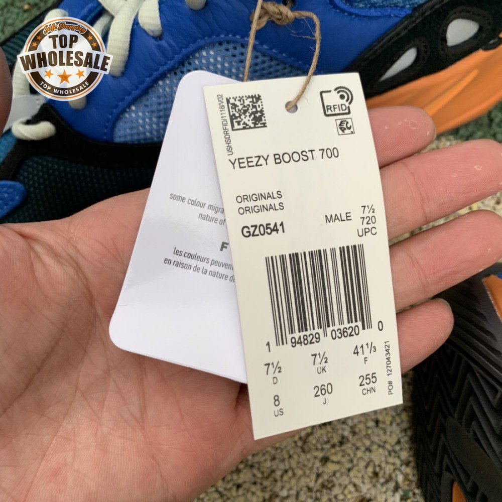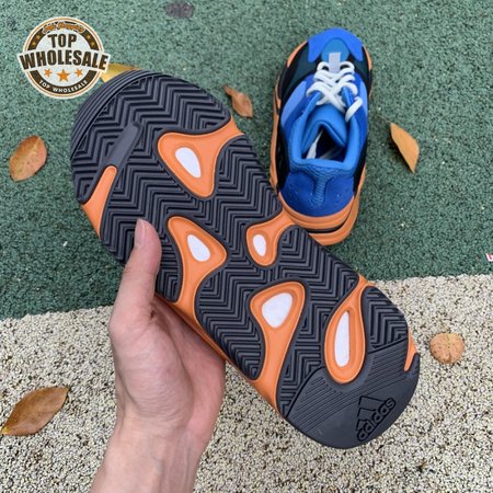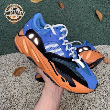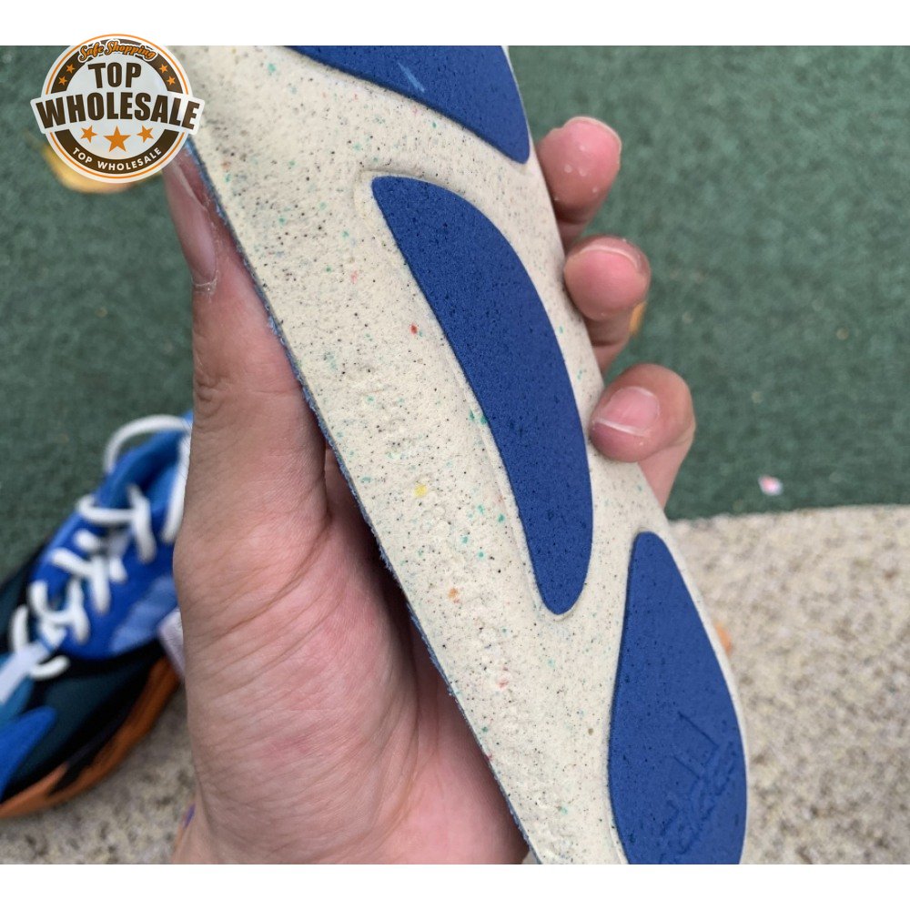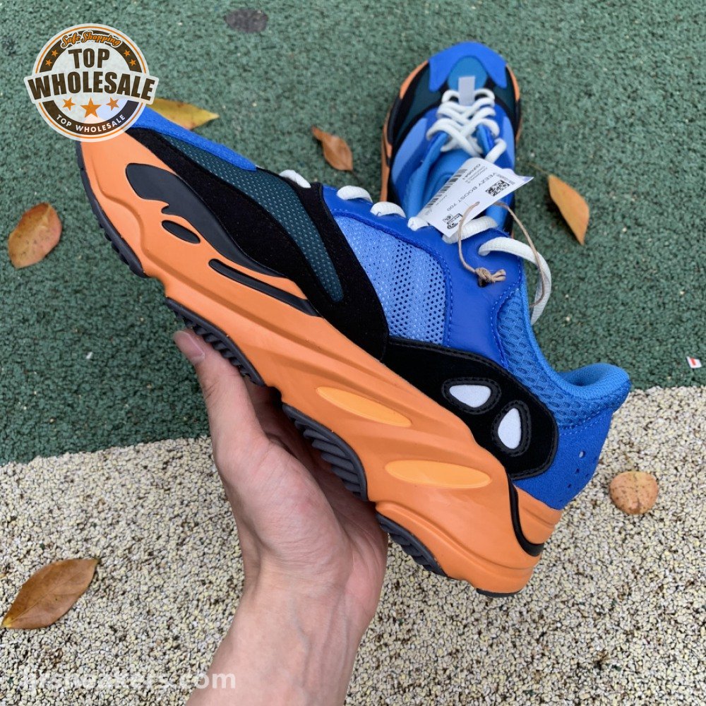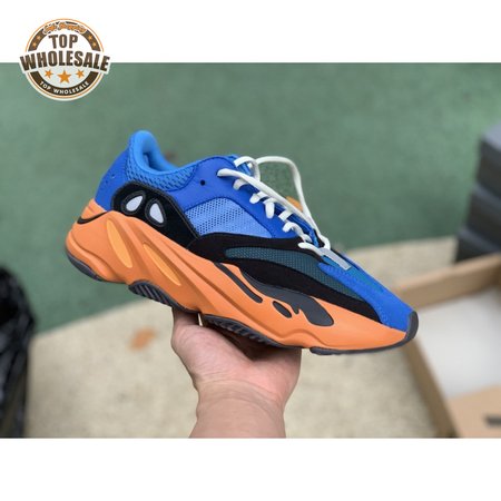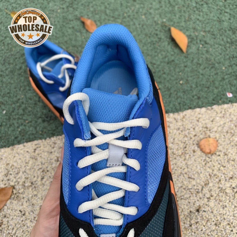 The adidas Yeezy Boost 700 "Bright Blue" uses sharply contrasting finishes to delineate the lifestyle runner"s upper and tooling. The latter pairs sculpted orange sidewalls with a contrasting black rubber outsole, featuring a herringbone traction pattern with cut-out detailing that reveals a drop-in Boost midsole. Up top, royal blue mesh is reinforced with tonal suede overlays at the toe and heel, along with black suede midfoot panels enlivened with reflective detailing.