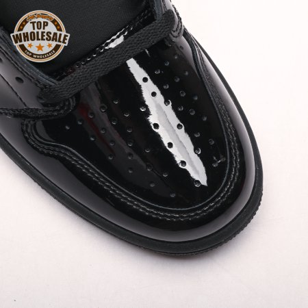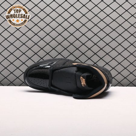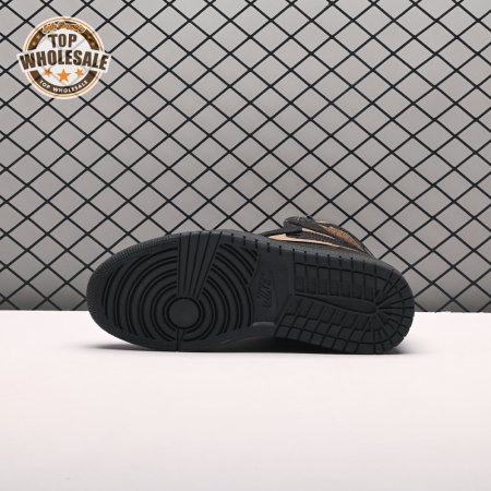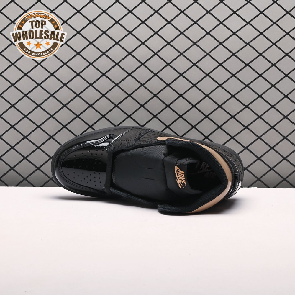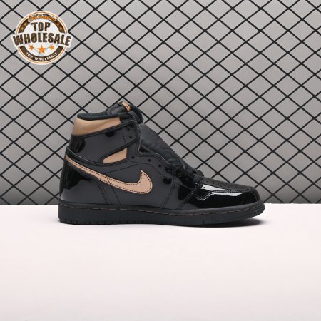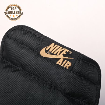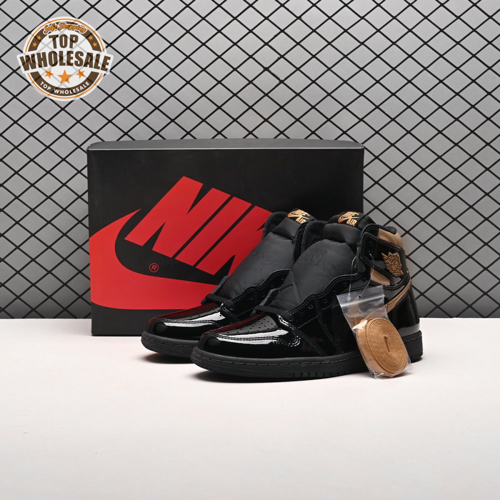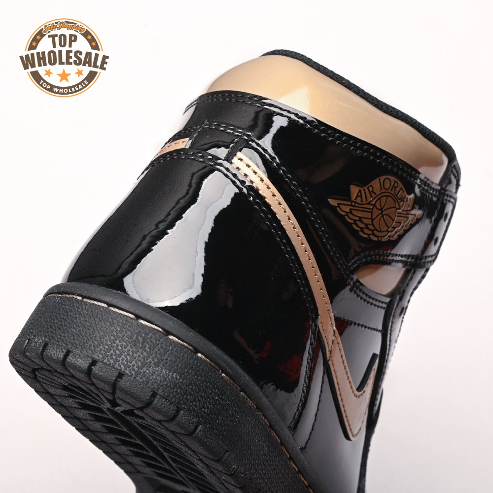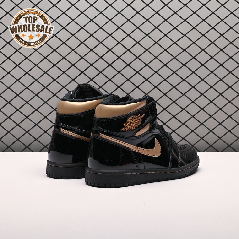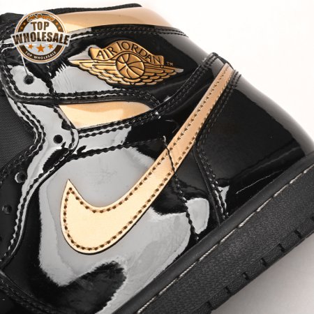 The Air Jordan 1 Retro High OG "Black Metallic Gold" seemingly takes inspiration from an Air Jordan 1 Mid from 2003 that similarly utilized a black patent leather upper with gilded accents. This pair adds OG touches in the form of a printed Wings logo on the lateral collar flap and a woven Nike tag atop the lightly padded nylon tongue. The two-tone palette is repeated on the sneaker"s tooling, featuring gold stitching that circles the black rubber cupsole.