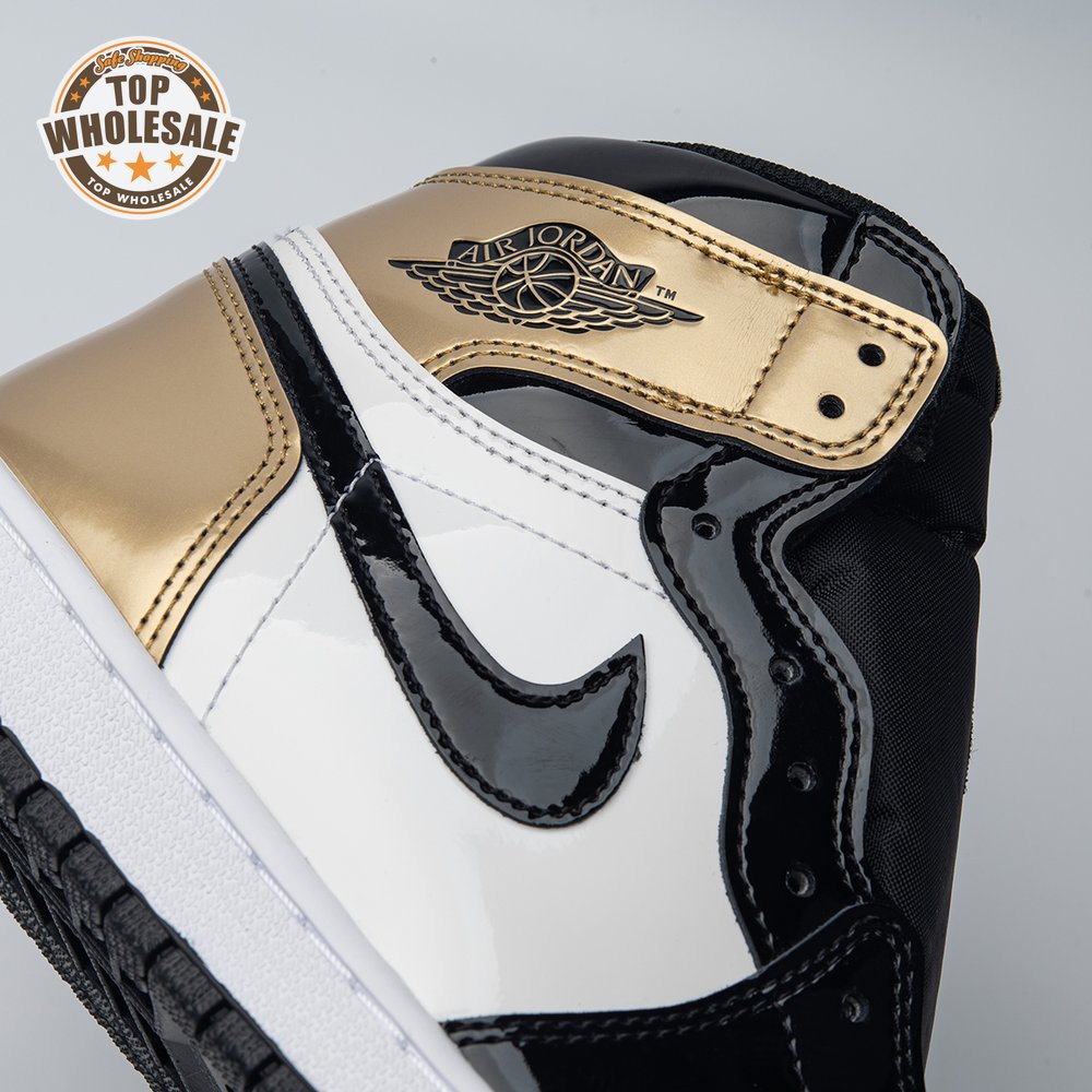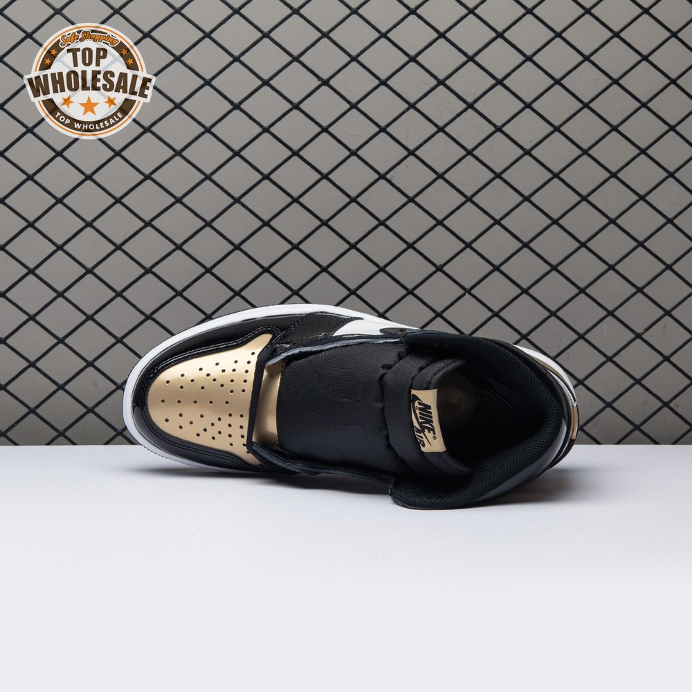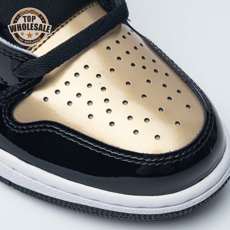 The Air Jordan 1 Retro High OG NRG 'Gold Toe' features a black patent leather upper with distinctive metallic gold accents on the perforated toe box, tongue branding, and the heel panel. The high top also boasts a white side panel which extends from the midfoot to the heel, and a white rubber midsole. Other details include suede accents on the lacing structure, large Swoosh branding, and a tonal black outsole.