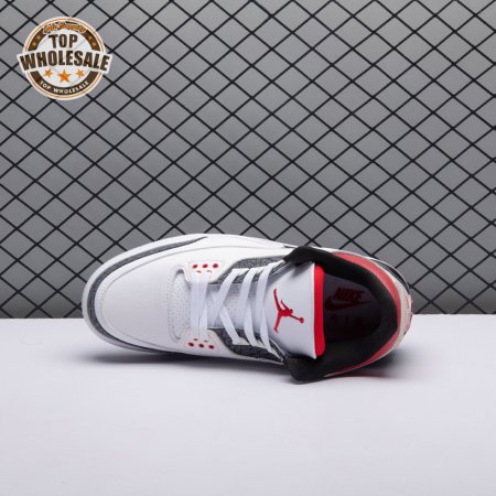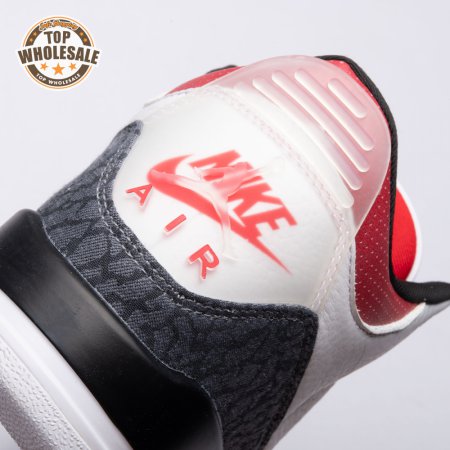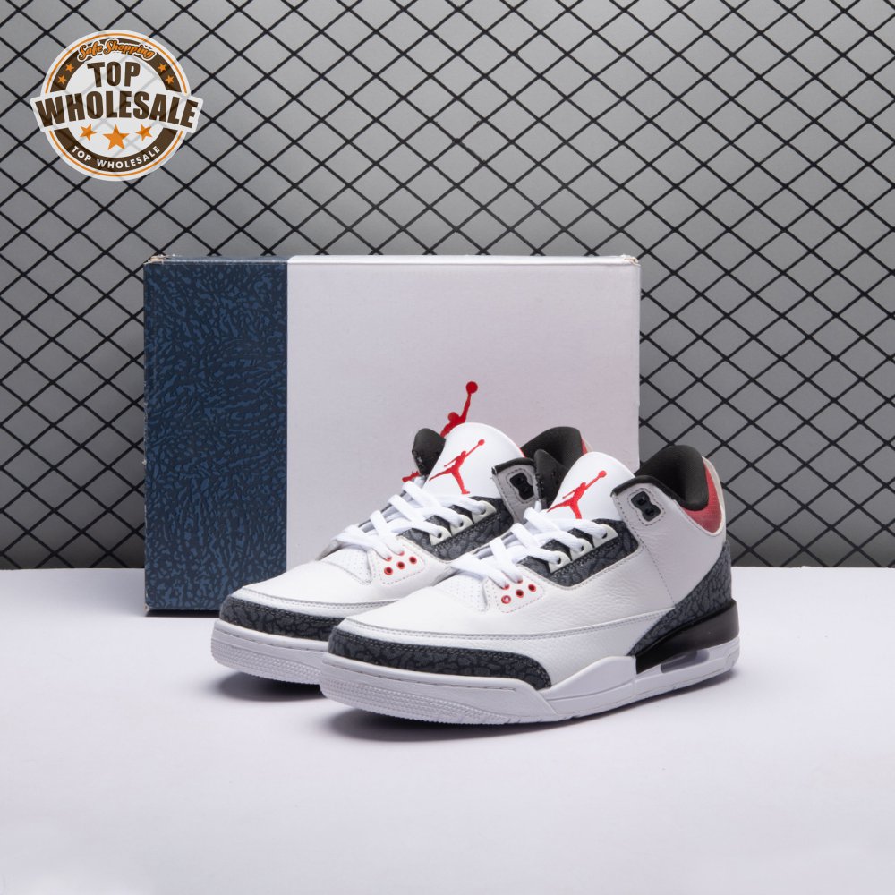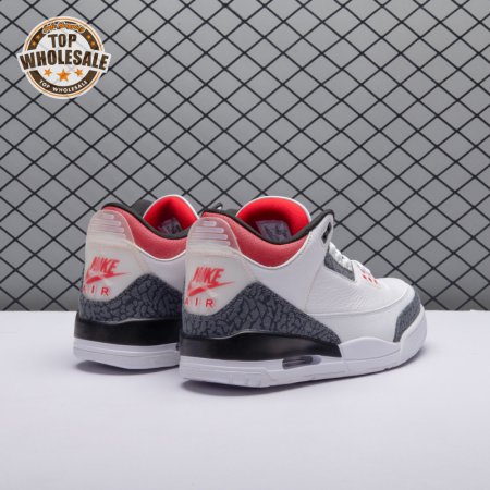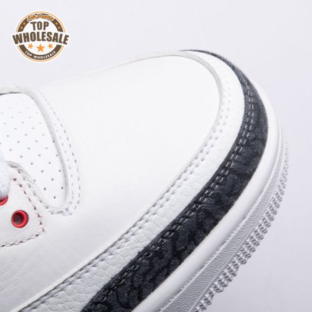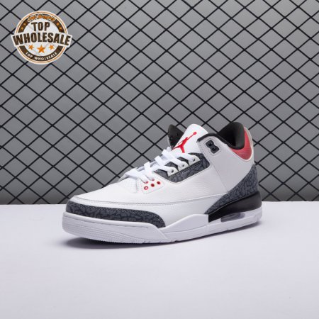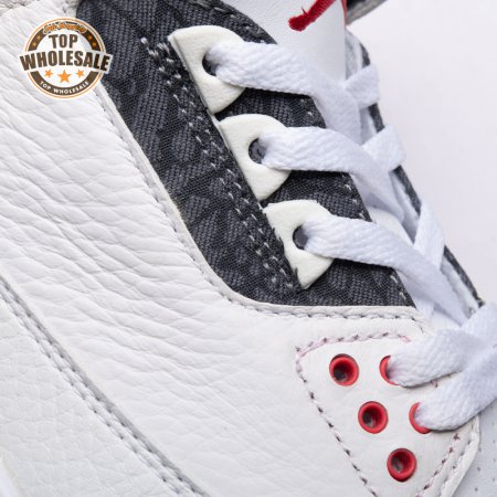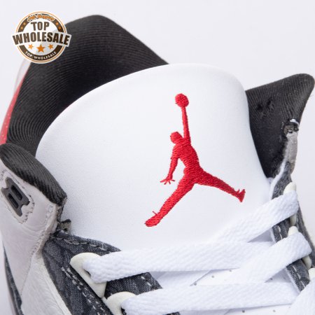 The Air Jordan 3 Retro Denim SE "Fire Red" draws inspiration from premium Japanese denim, featuring the twill material on the signature elephant-print overlays at the toe, heel and eyestay. The rest of the upper is constructed from white tumbled leather with contrasting Fire Red accents on the metal eyelets and perforated leather collar. The crimson hue is repeated on the sneaker"s branding hits, including a Nike logo on the translucent heel piece.