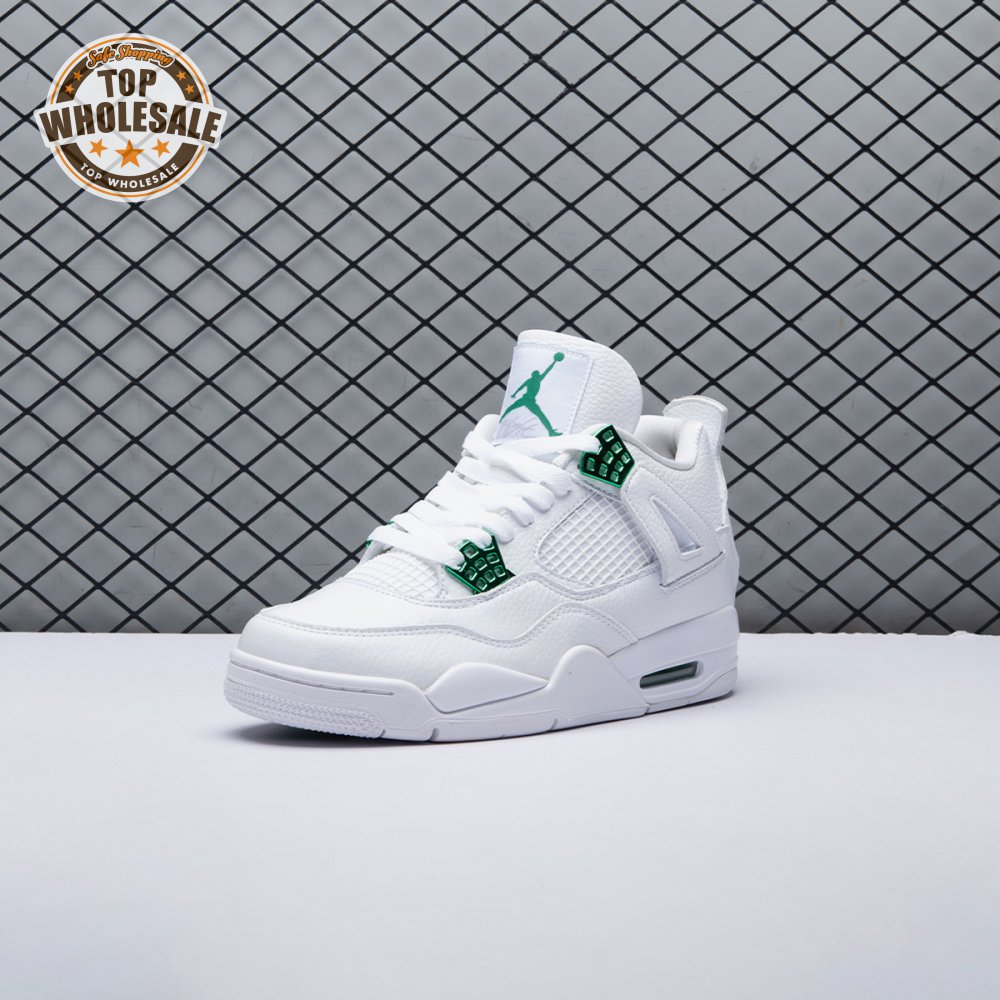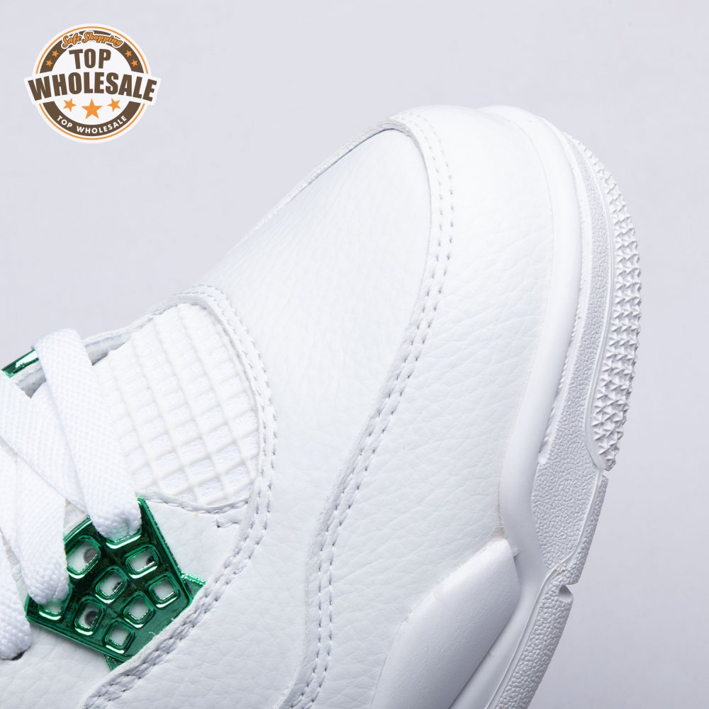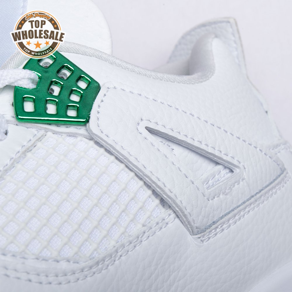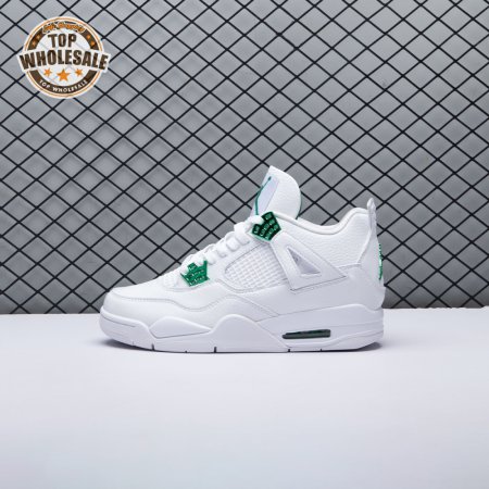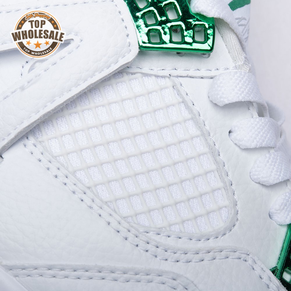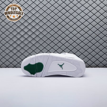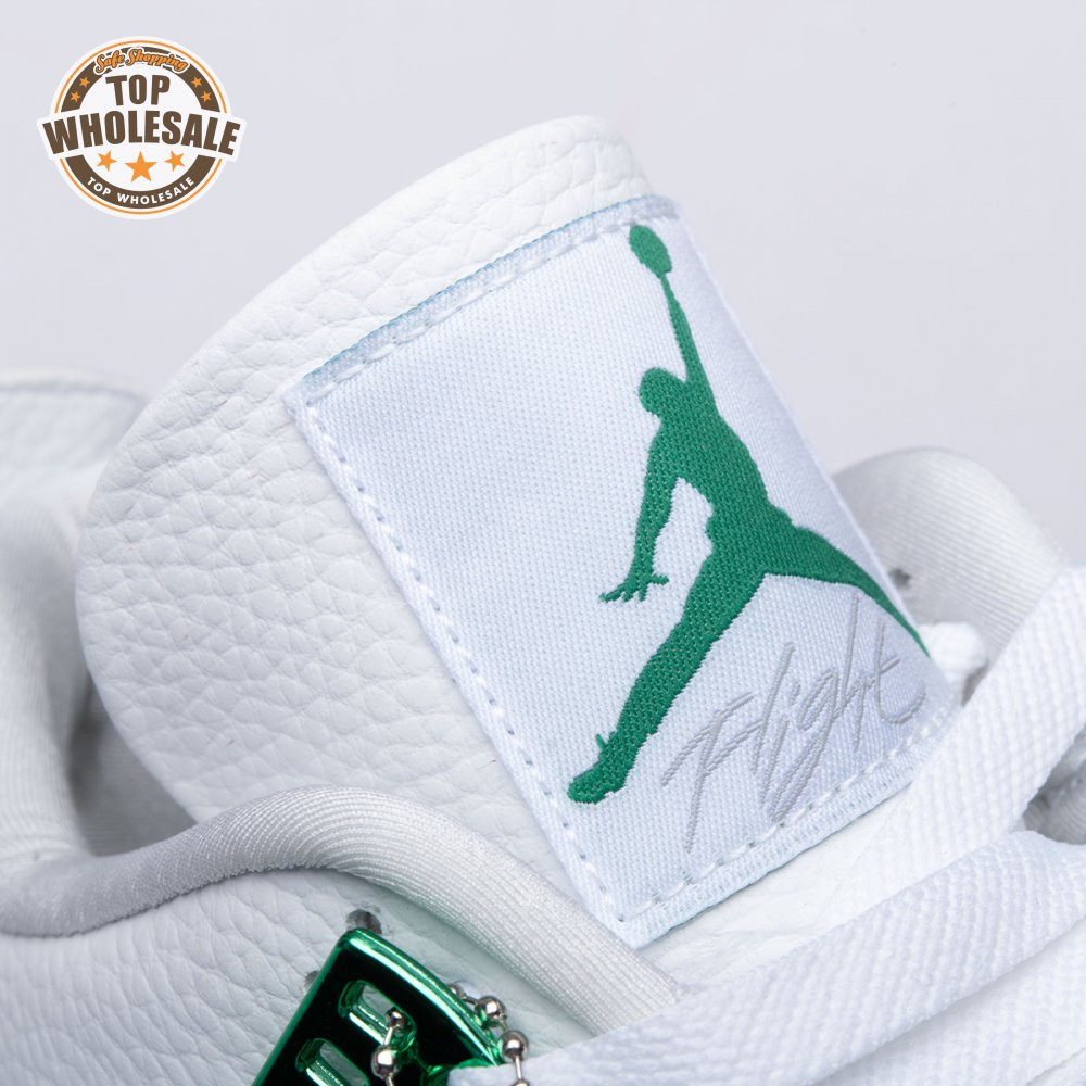 The Air Jordan 4 Retro "Green Metallic" is drawn from a four-piece Metallic Pack that features a single accent color. Here, the metallic green hue is limited to the sneaker"s molded eyelets, interior tongue, and the Jumpman logos that adorn the heel and woven tongue tag. Those elements stand out against a pristine all-white leather build, appointed with standard Air Jordan 4 details that include quarter-panel netting, a visible Air sole unit and an extended pull tab at the heel.