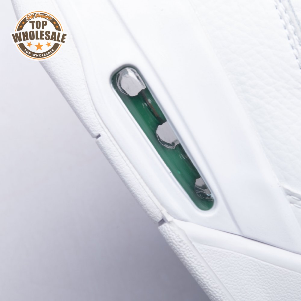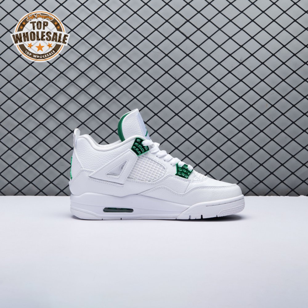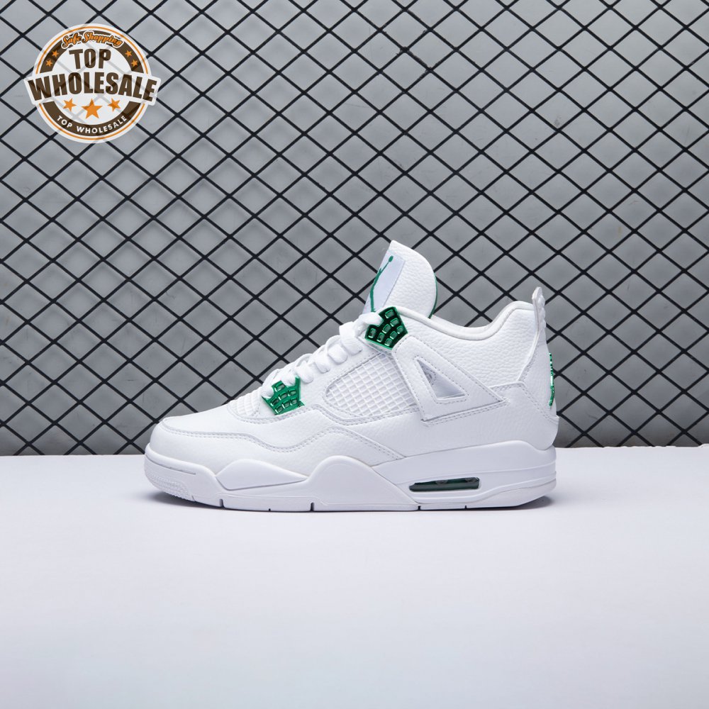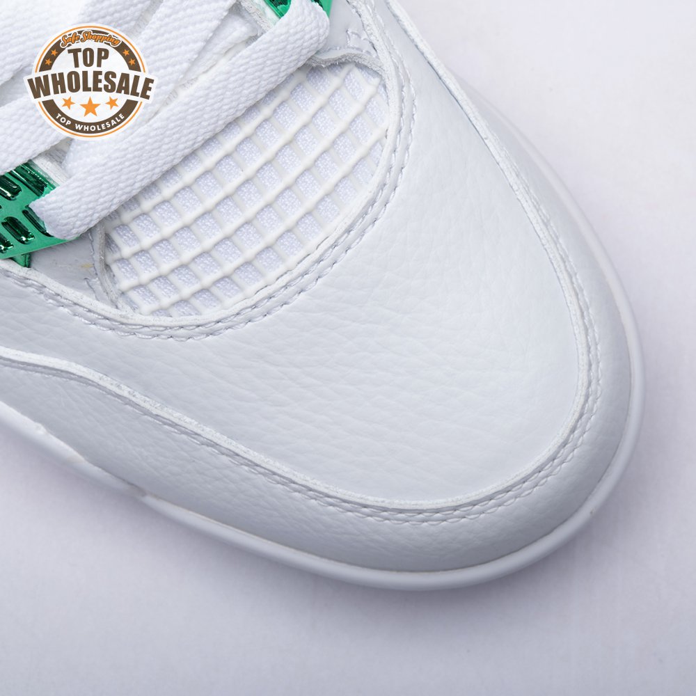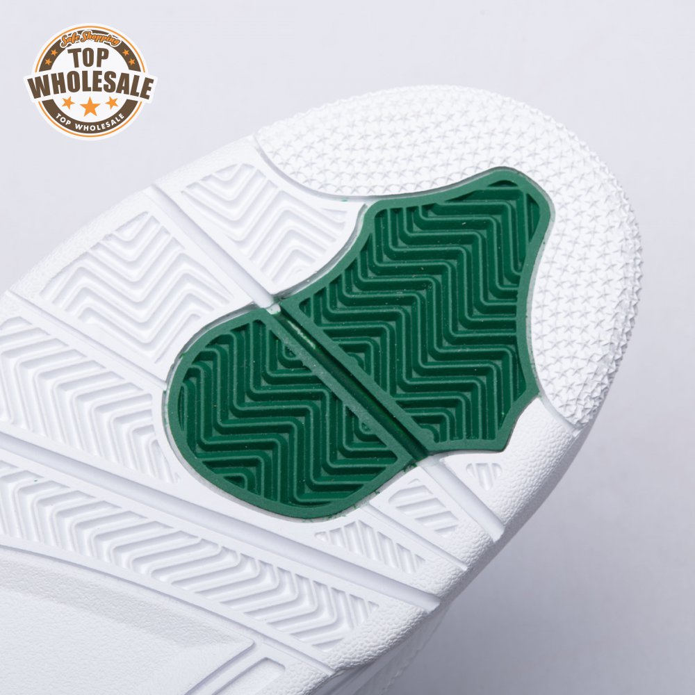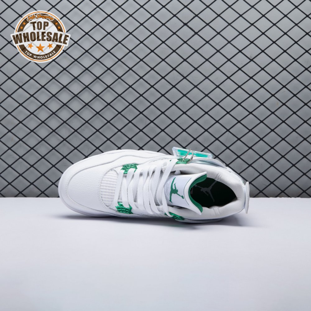 The Air Jordan 4 Retro "Green Metallic" is drawn from a four-piece Metallic Pack that features a single accent color. Here, the metallic green hue is limited to the sneaker"s molded eyelets, interior tongue, and the Jumpman logos that adorn the heel and woven tongue tag. Those elements stand out against a pristine all-white leather build, appointed with standard Air Jordan 4 details that include quarter-panel netting, a visible Air sole unit and an extended pull tab at the heel.