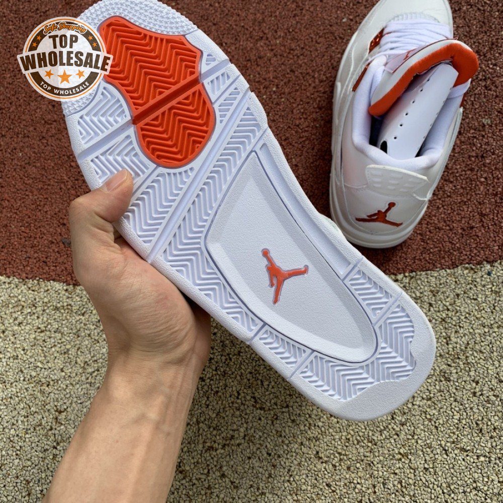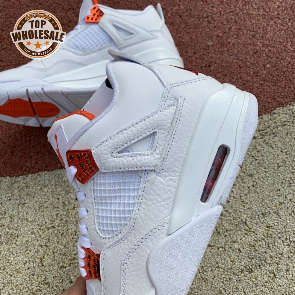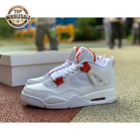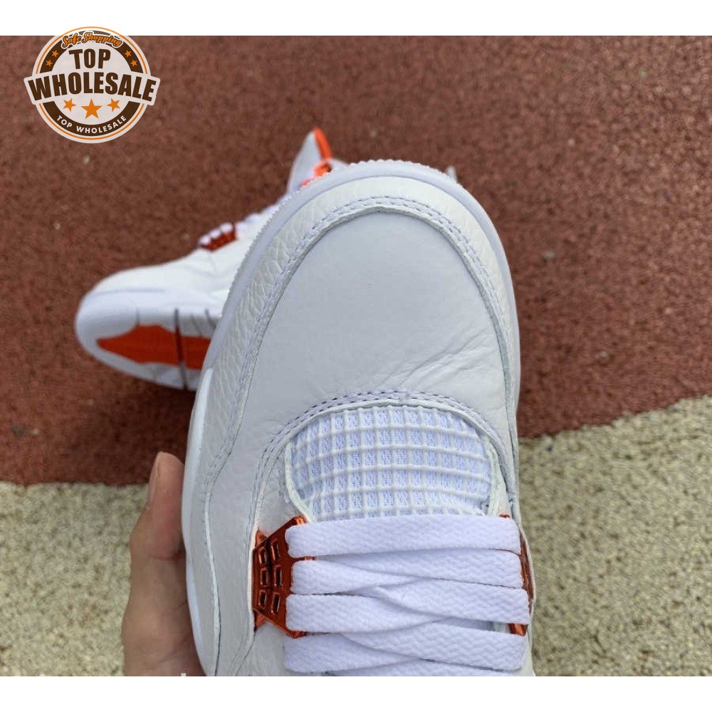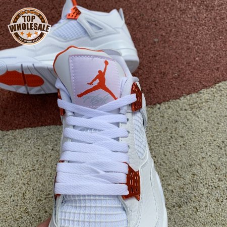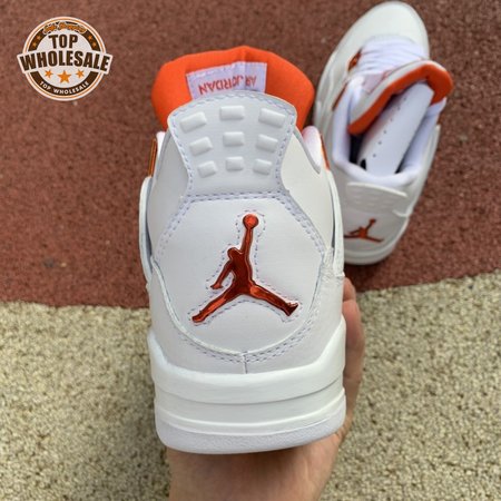The Air Jordan 4 Retro "Orange Metallic" dons an all-white leather build, with its white monochromatic finish punctuated by sharp bursts of Team Orange on the eyelets, interior tongue and Jumpman branding hits, located on the woven tongue tag and heel. The visible Max Air unit embedded in the heel of the midsole is similarly tinted orange. The kicks dropped alongside three additional colorways in Court Purple, University Red and Pine Green.