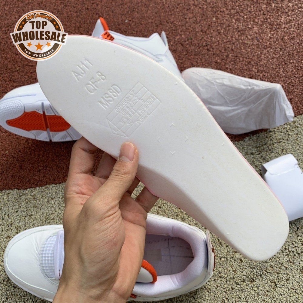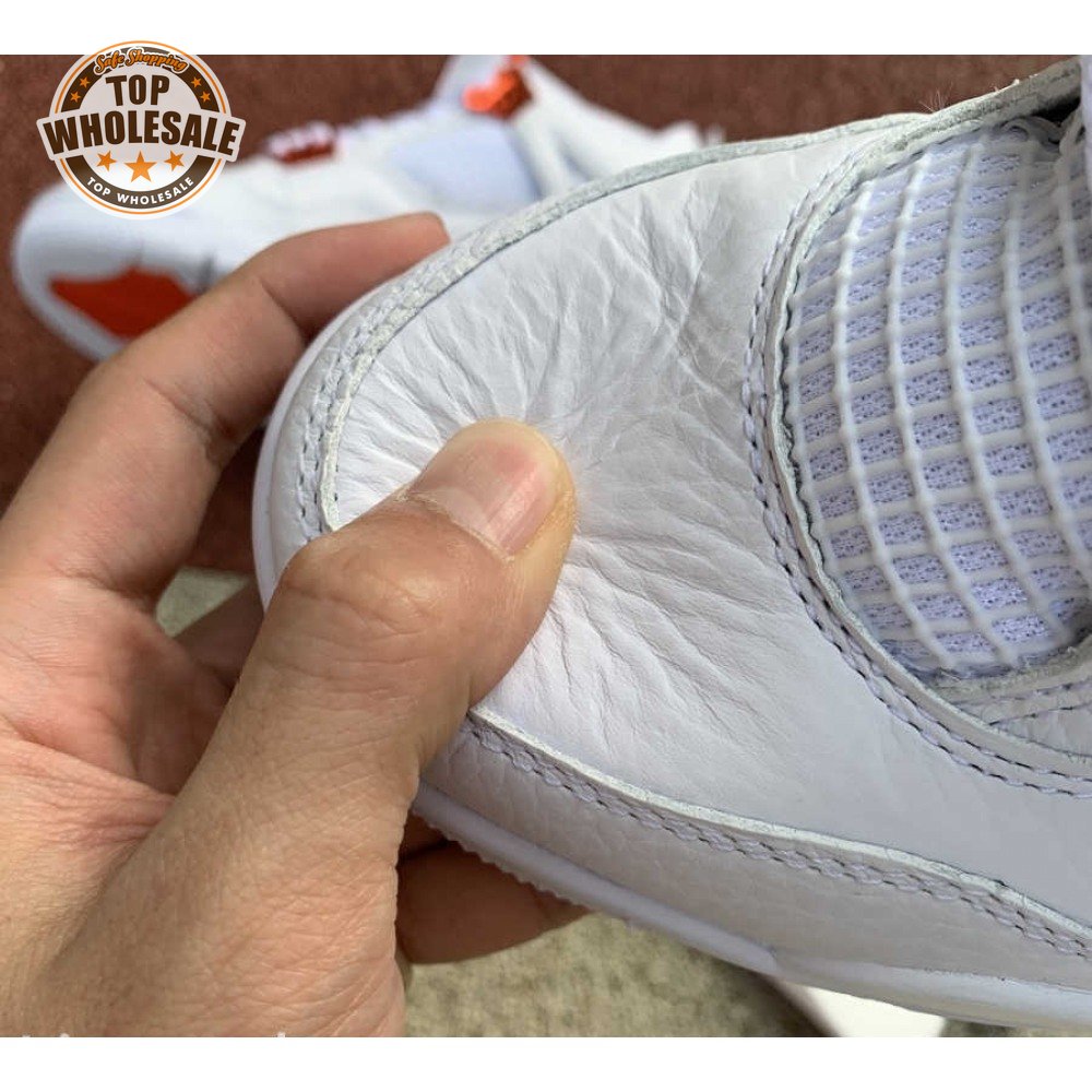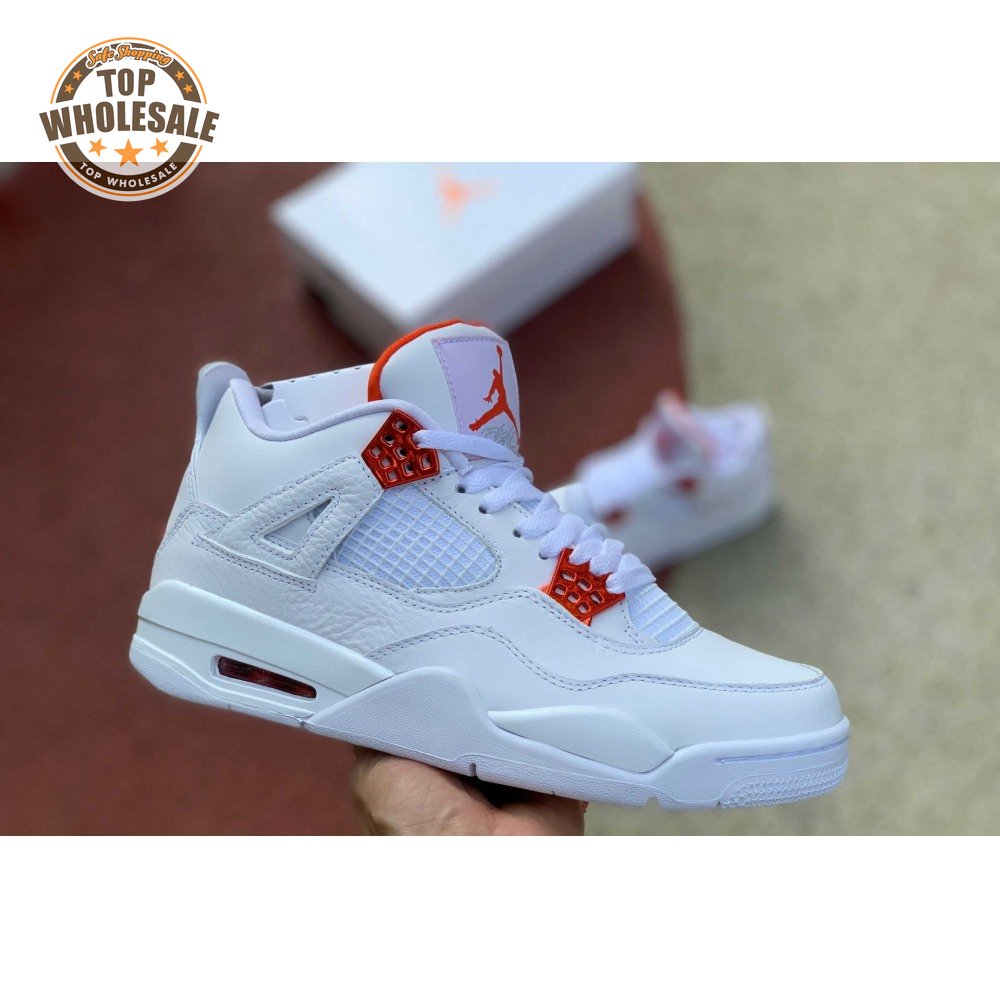 The Air Jordan 4 Retro "Orange Metallic" dons an all-white leather build, with its white monochromatic finish punctuated by sharp bursts of Team Orange on the eyelets, interior tongue and Jumpman branding hits, located on the woven tongue tag and heel. The visible Max Air unit embedded in the heel of the midsole is similarly tinted orange. The kicks dropped alongside three additional colorways in Court Purple, University Red and Pine Green.