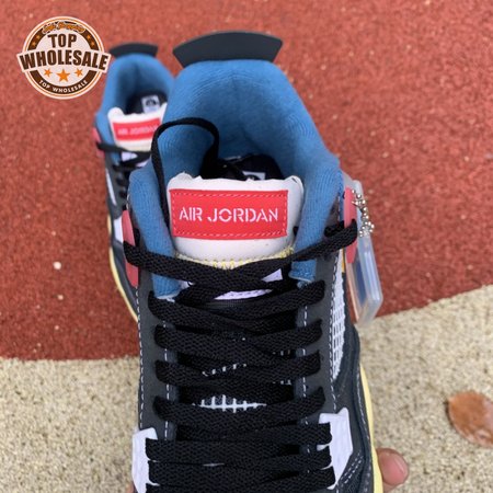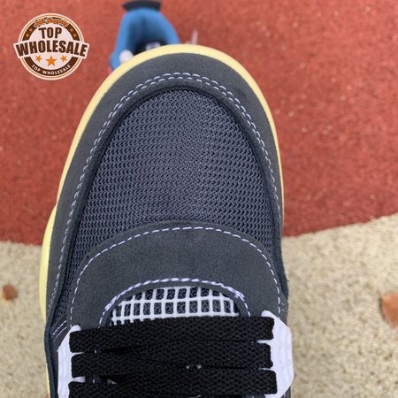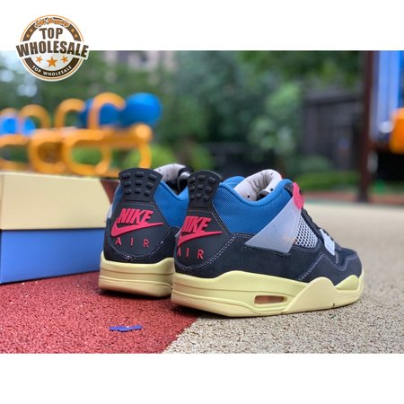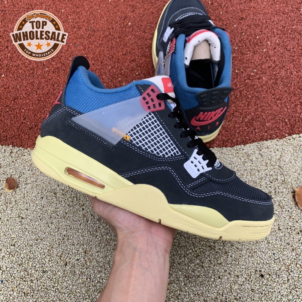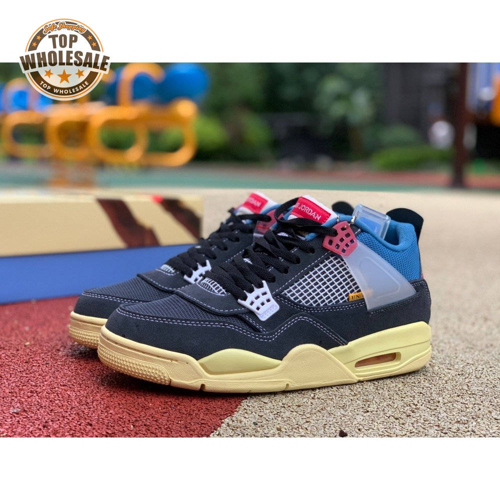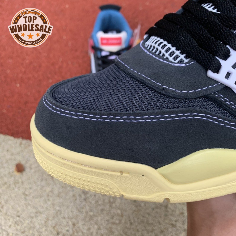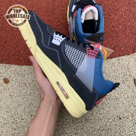 The Union LA x Air Jordan 4 Retro "Off Noir" represents the follow-up effort to the duo"s highly coveted Air Jordan 1 collaboration from 2018. The updated design features a black suede upper with matching black mesh on the toe box and blue mesh around the collar. The semi-translucent structural wings are attached to molded red eyelets, matching the woven Air Jordan tag atop the padded tongue and Nike Air branding on the heel. The TPU wings are filled in, reminiscent of an original Tinker Hatfield sketch of the AJ4, while the AIR JORDAN tag usually found on the inside of the tongue conveys a unique look, like someone folded the tongue over to expose the inside tag. Finally, a 'UN/LA' tag on the side panel shows the Union heritage and a yellowed midsole conveys a vintage aesthetic.