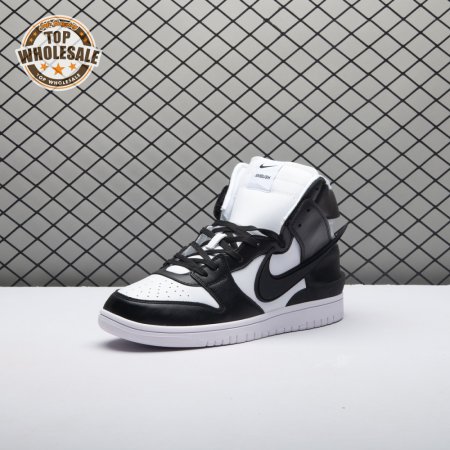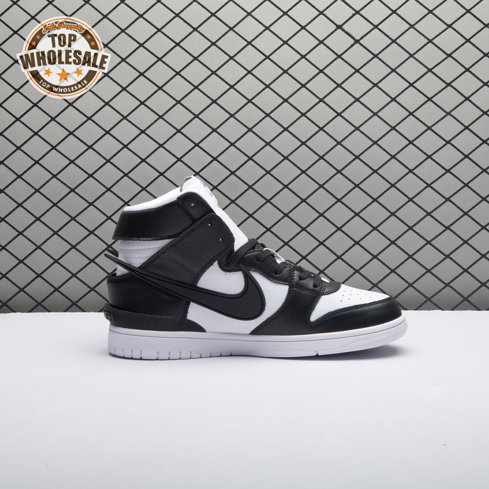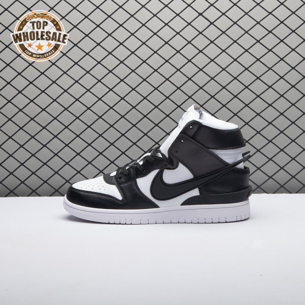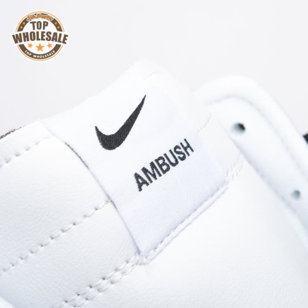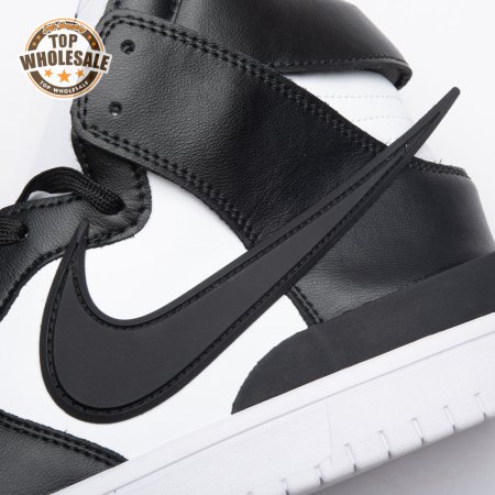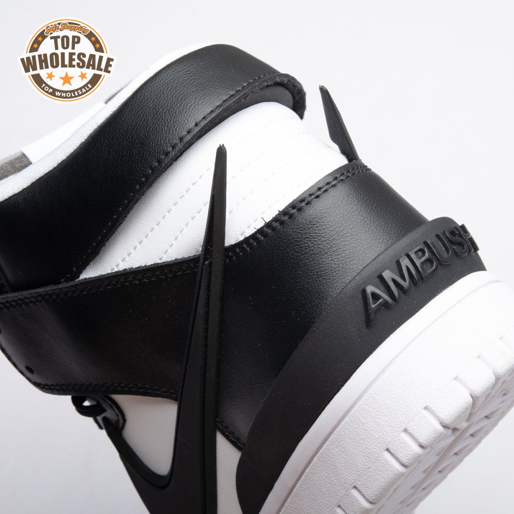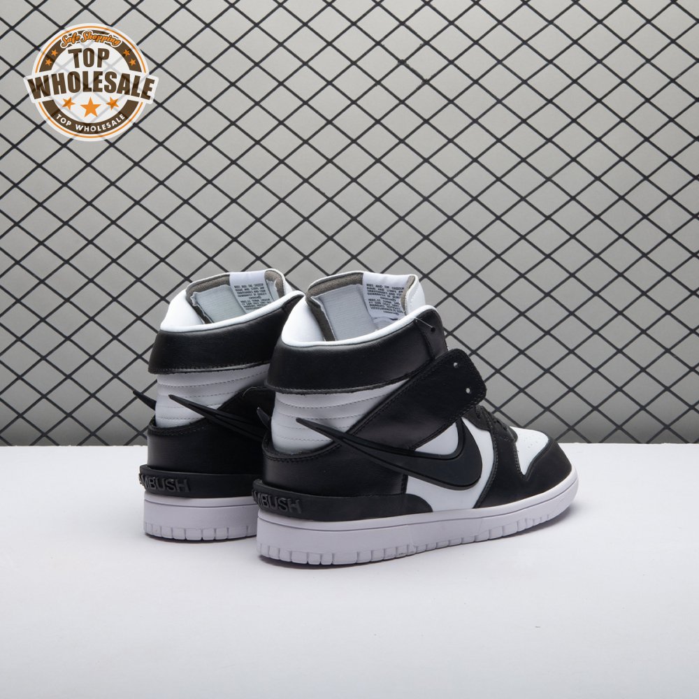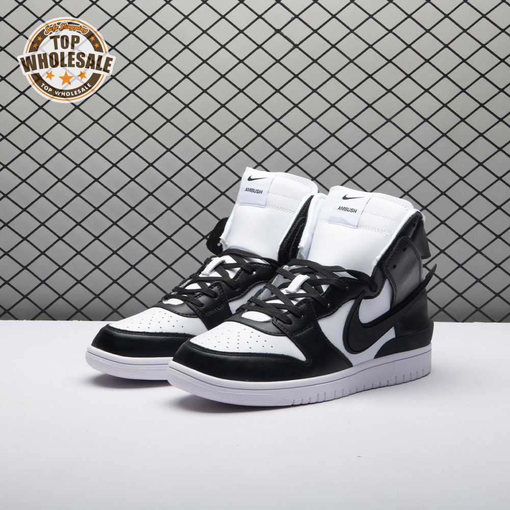 Designed as a joint venture with the Tokyo-based fashion label, the AMBUSH x Nike Dunk High "Black" applies an essential two-tone color scheme to a reconstituted leather build with exaggerated details. The latter is highlighted by an oversized, elongated Swoosh, its pointed tail extending past the back of the shoe to convey a dynamic sense of movement. AMBUSH branding decorates an added TPU heel counter and a woven tag atop the sneaker"s exposed foam tongue.