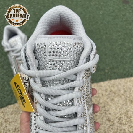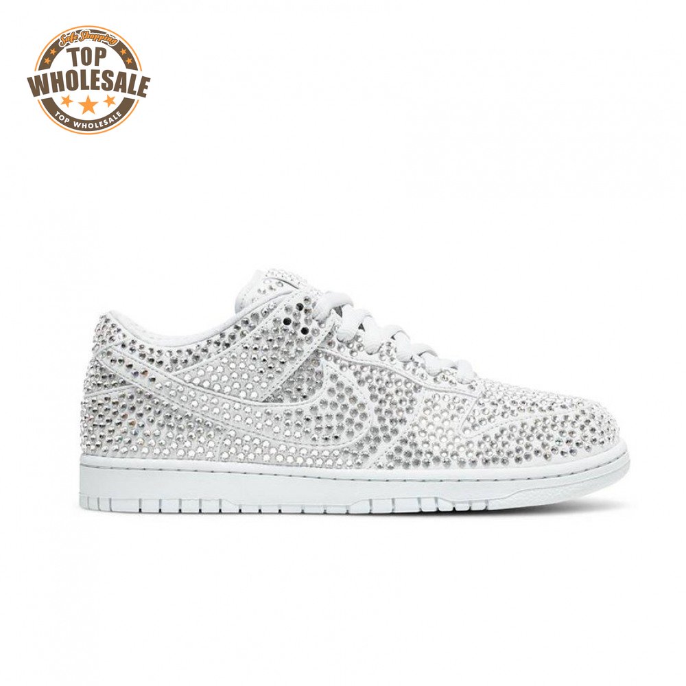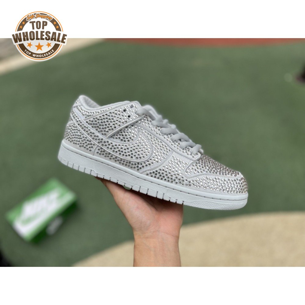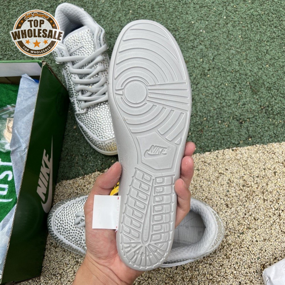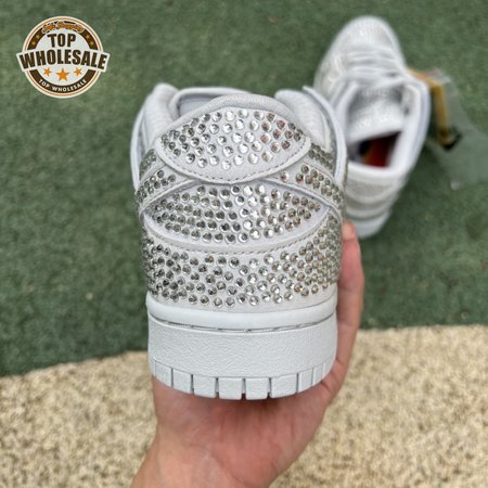 Designed in partnership with the LA-based streetwear brand, the Cactus Plant Flea Market x Swarovski x Nike Dunk Low "Pure Platinum" delivers an opulent take on the classic silhouette. Every inch of the suede upper is entirely covered in Swarovski crystals, including the detachable double lace flaps, heavily padded tongue and oversized Swoosh, the latter borrowed from CPFM"s previous Nike Blazer collaboration from 2019.