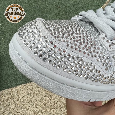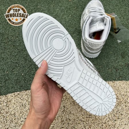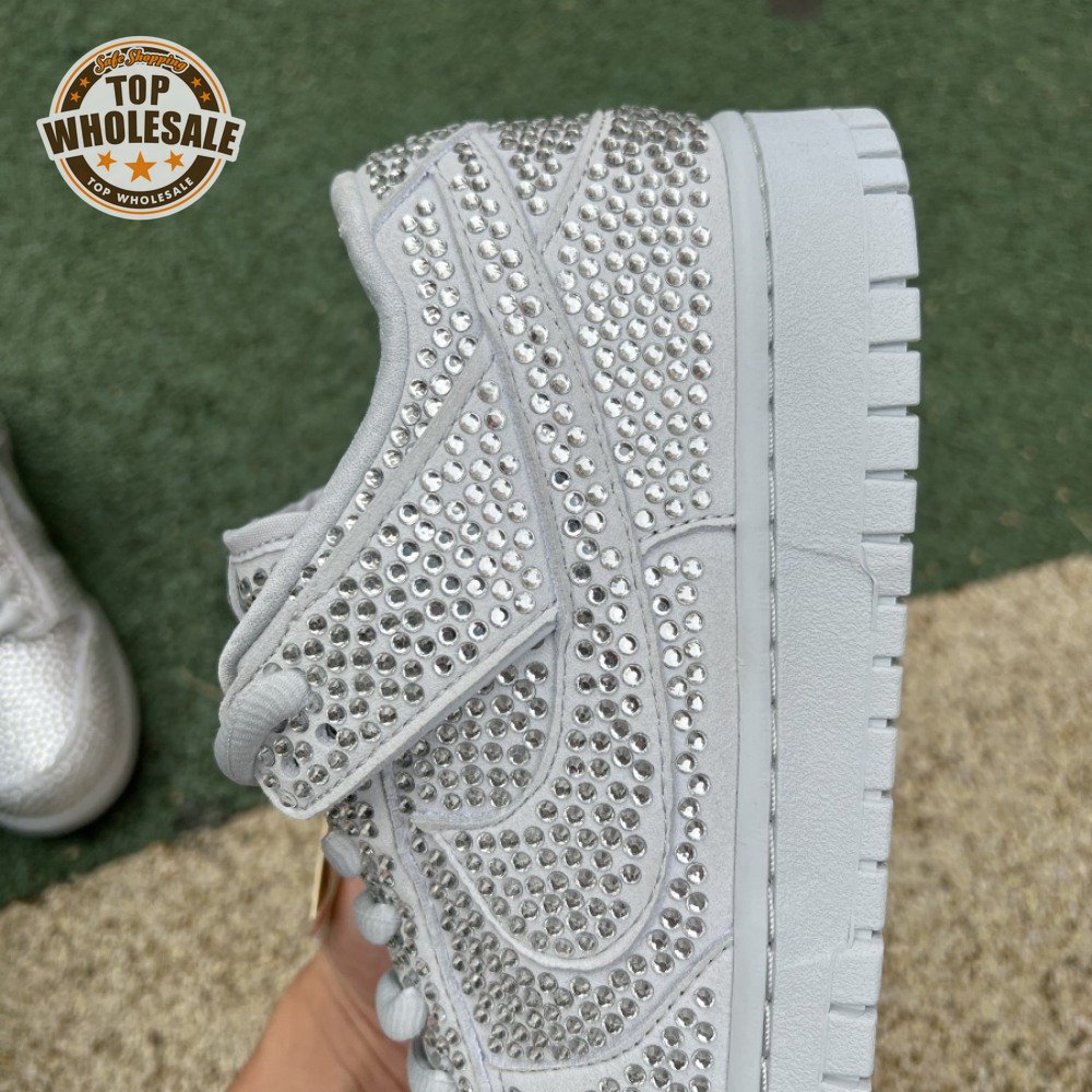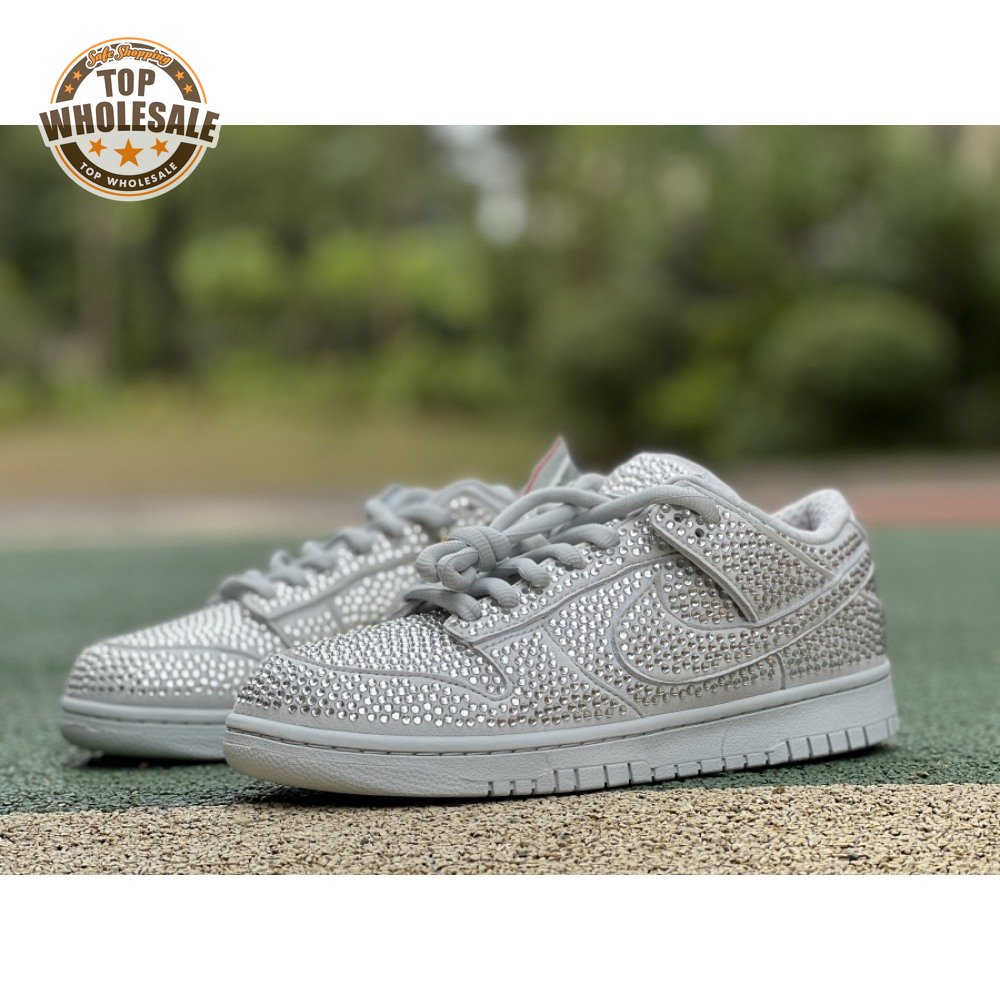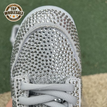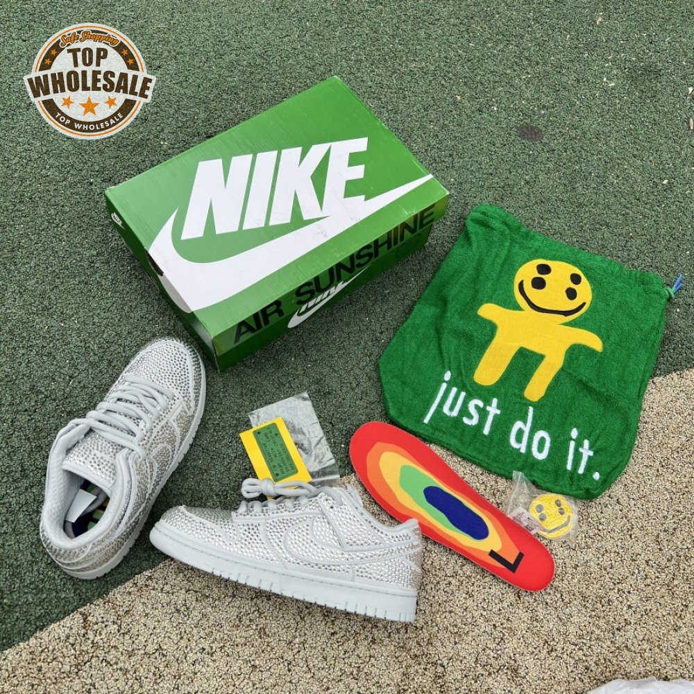 Designed in partnership with the LA-based streetwear brand, the Cactus Plant Flea Market x Swarovski x Nike Dunk Low "Pure Platinum" delivers an opulent take on the classic silhouette. Every inch of the suede upper is entirely covered in Swarovski crystals, including the detachable double lace flaps, heavily padded tongue and oversized Swoosh, the latter borrowed from CPFM"s previous Nike Blazer collaboration from 2019.