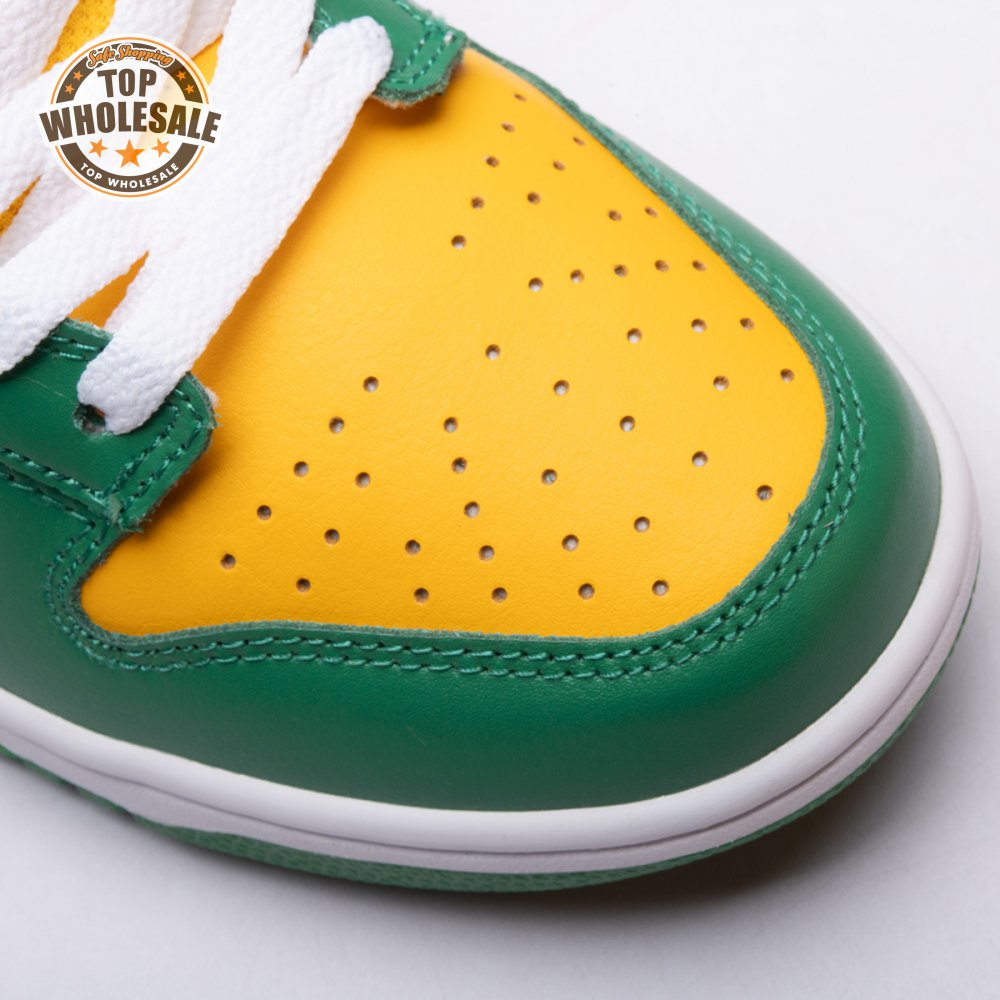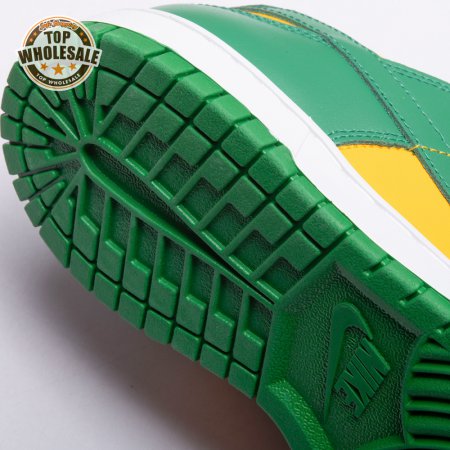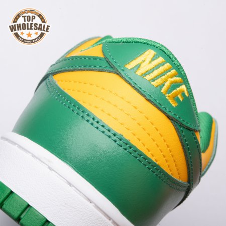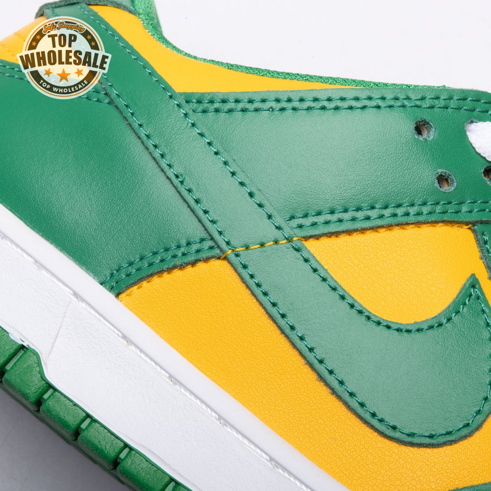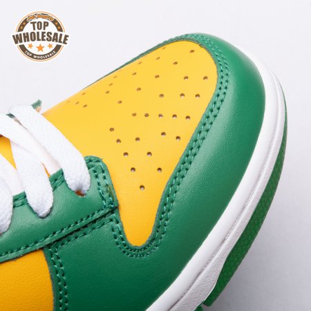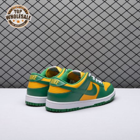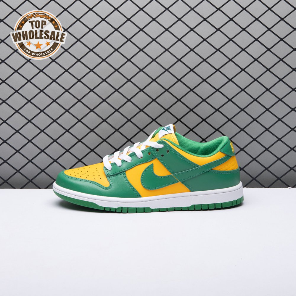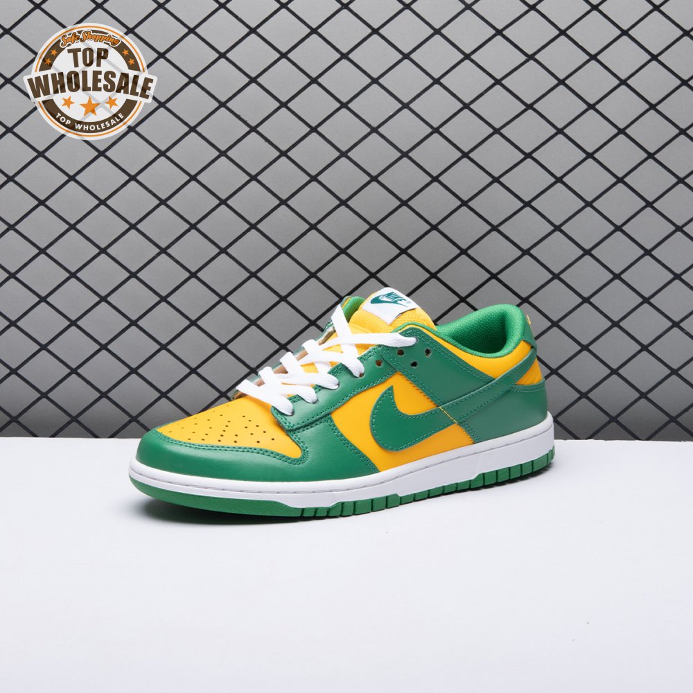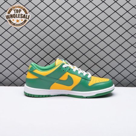 The Nike Dunk Low SP "Brazil" replicates the look of the classic "Brazil" Dunk from 2001, featuring a simple two-tone color scheme that combines a yellow leather base with contrasting green overlays. Nike branding adorns the heel tab and stitched-on woven tag atop the lightly padded nylon tongue. The low-profile silhouette is mounted on a sturdy white foam midsole, reinforced underfoot by a green rubber outsole.