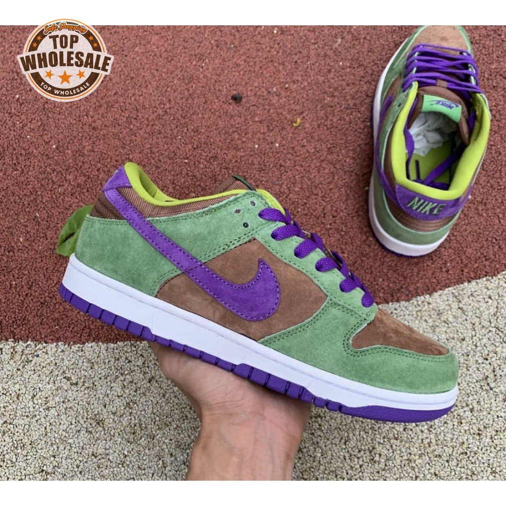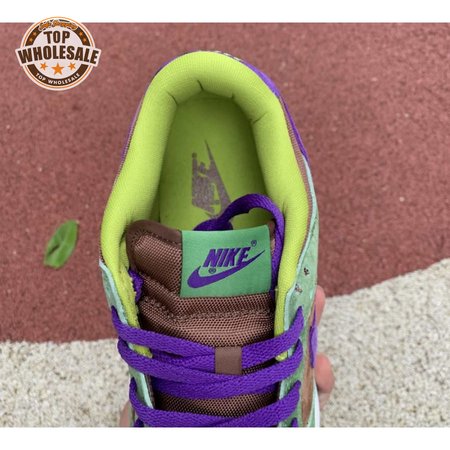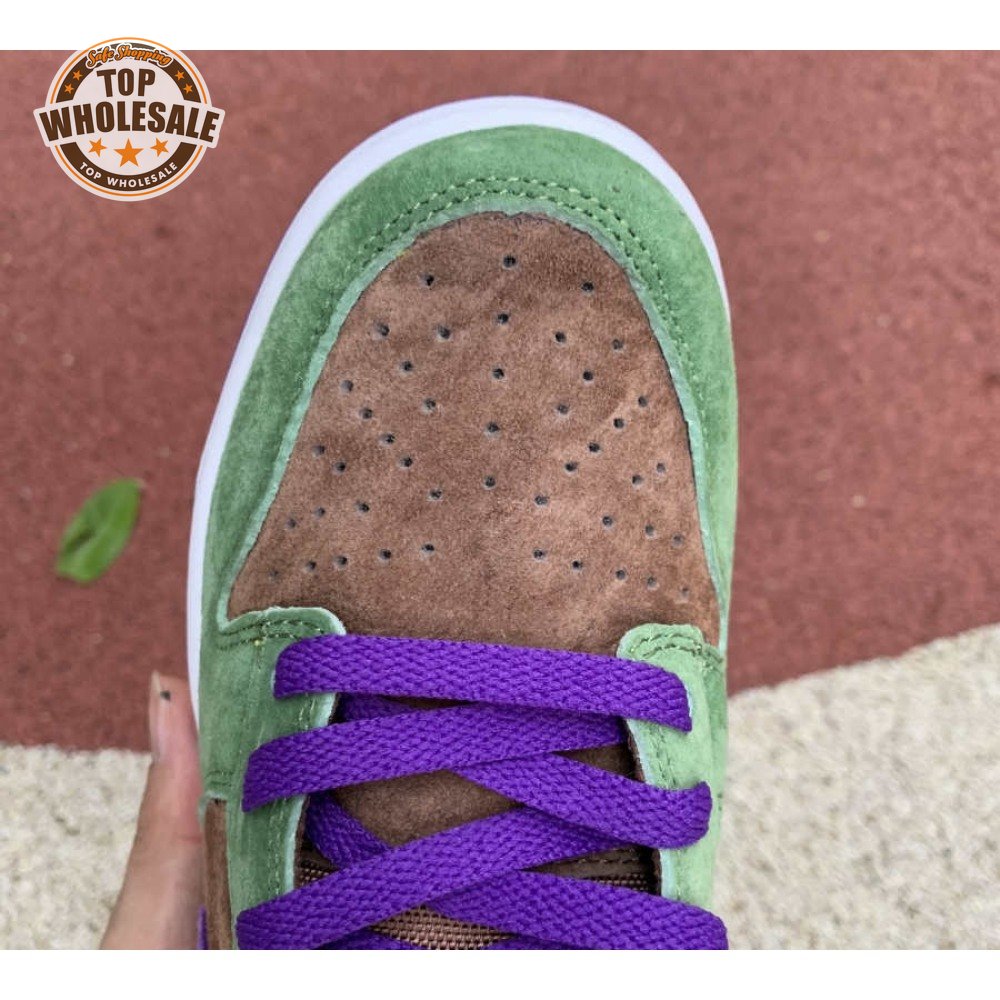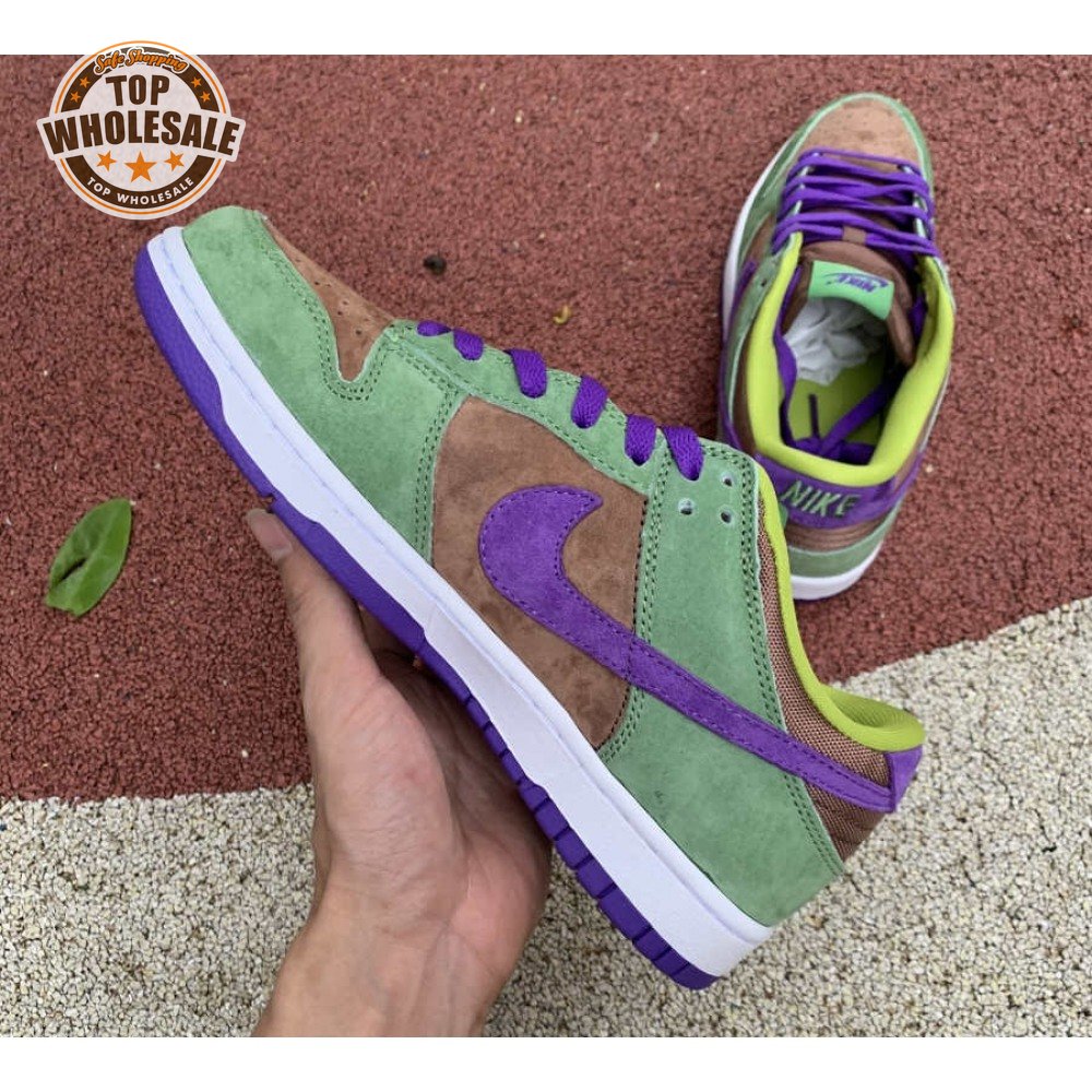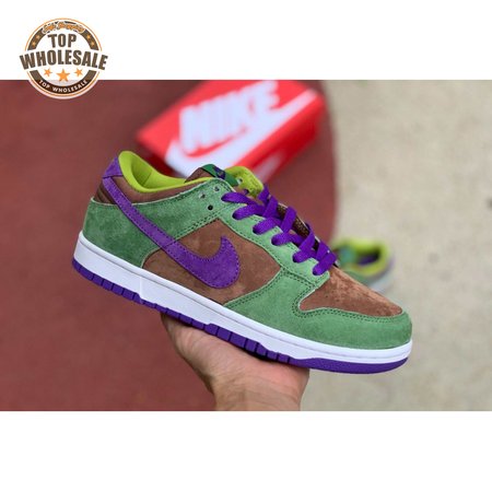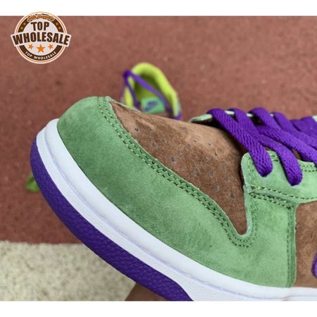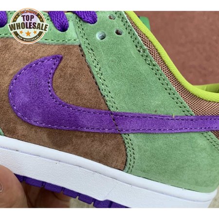 The 2020 edition of the Nike Dunk Low SP Retro "Veneer" brings back one of the original colorways from the CO.JP "Ugly Duckling Pack" from 2001. Like its predecessor, the upper is almost entirely constructed from pigskin suede, finished in a discordant blend of brown, green and purple hues. Breathable mesh is applied to the collar and tongue, accented with a traditional woven Nike tag. An additional pop of violet distinguishes the sneaker"s rubber outsole.
