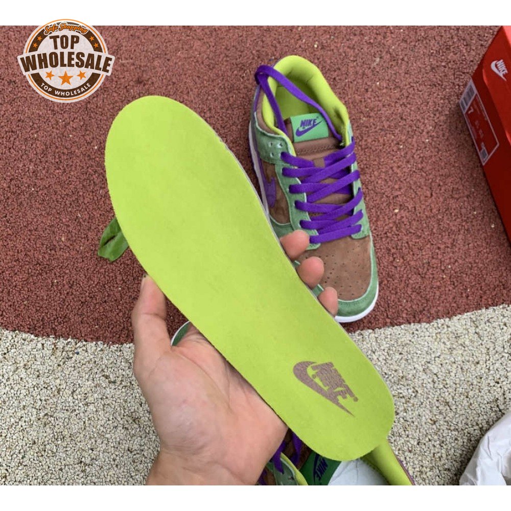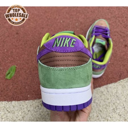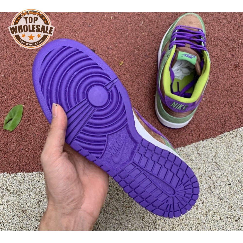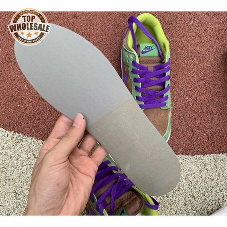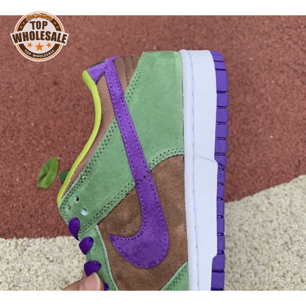 The 2020 edition of the Nike Dunk Low SP Retro "Veneer" brings back one of the original colorways from the CO.JP "Ugly Duckling Pack" from 2001. Like its predecessor, the upper is almost entirely constructed from pigskin suede, finished in a discordant blend of brown, green and purple hues. Breathable mesh is applied to the collar and tongue, accented with a traditional woven Nike tag. An additional pop of violet distinguishes the sneaker"s rubber outsole.
