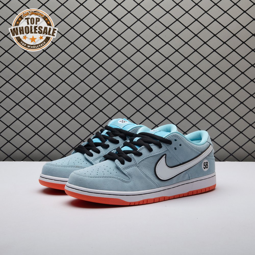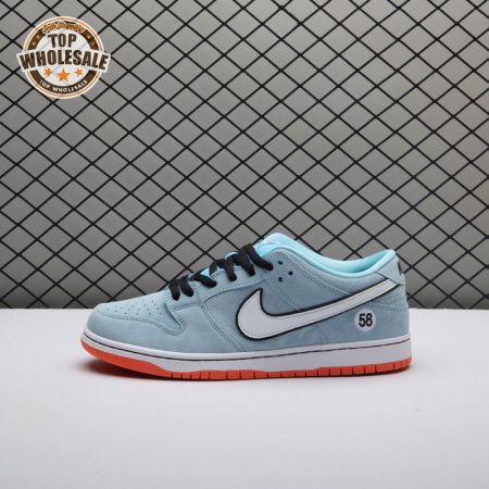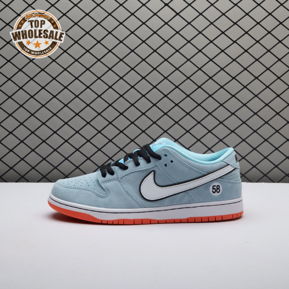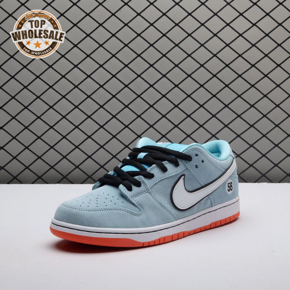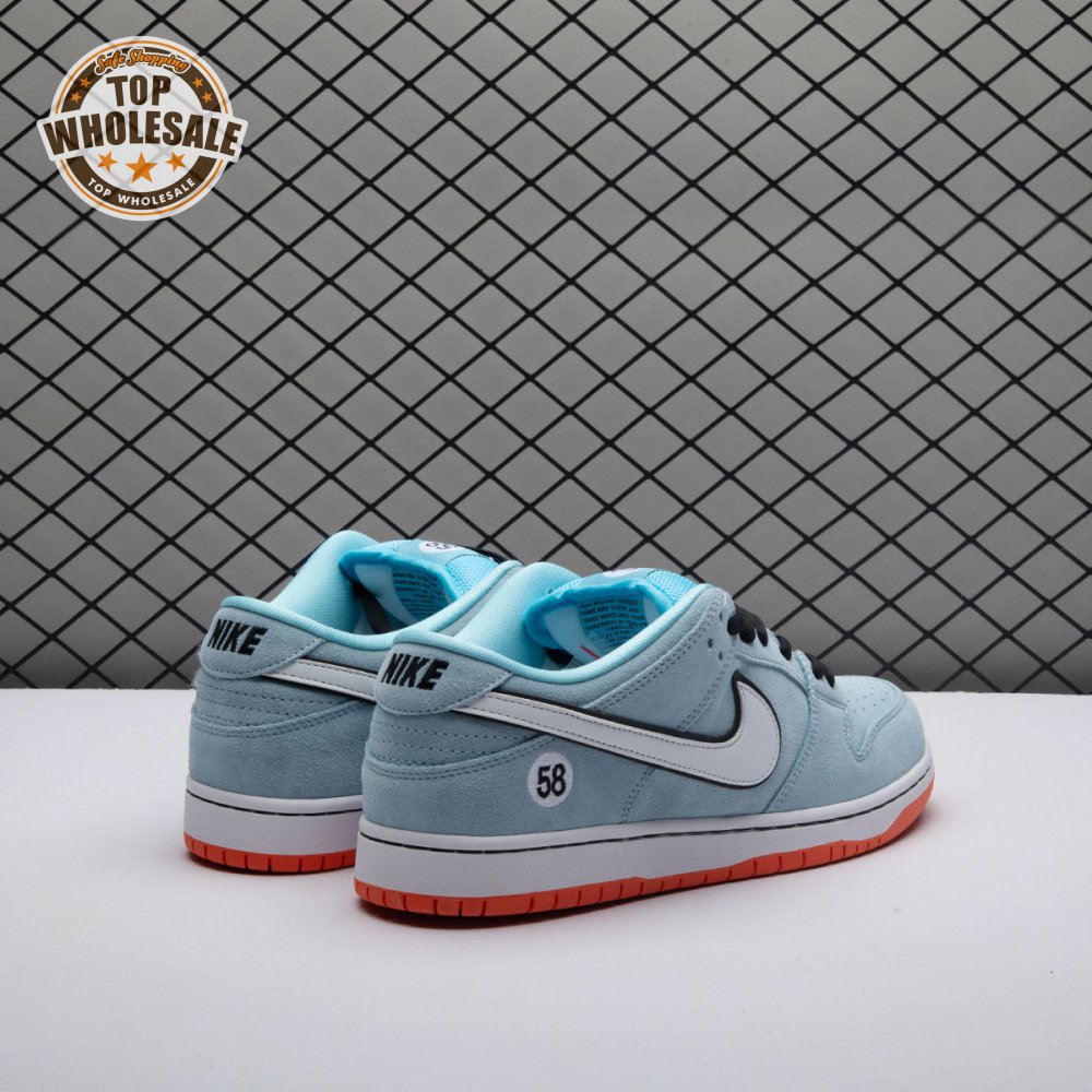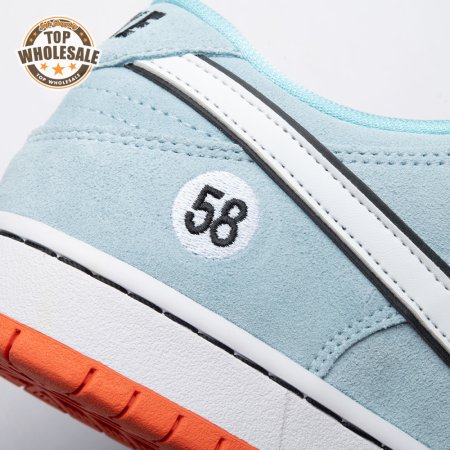The Nike Dunk Low Pro SB 'Gulf" is the follow-up to the Blazer Mid "Club 58" from 2018, both of which are designed in collaboration with a consortium of four prominent skate shops located in Western Europe. Light blue suede is utilized throughout the upper, accented with a white leather Swoosh and a circular 58 graphic on the lateral heel. The digits are repeated on the woven tag affixed to the stuffed mesh tongue. Underfoot, a bright orange rubber outsole delivers a contrasting pop of color.