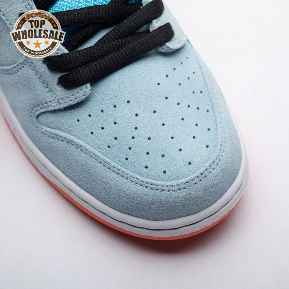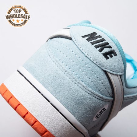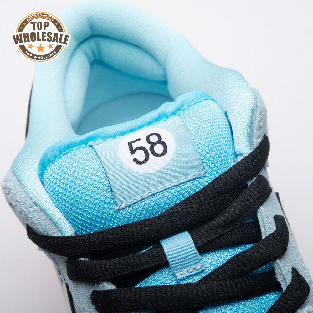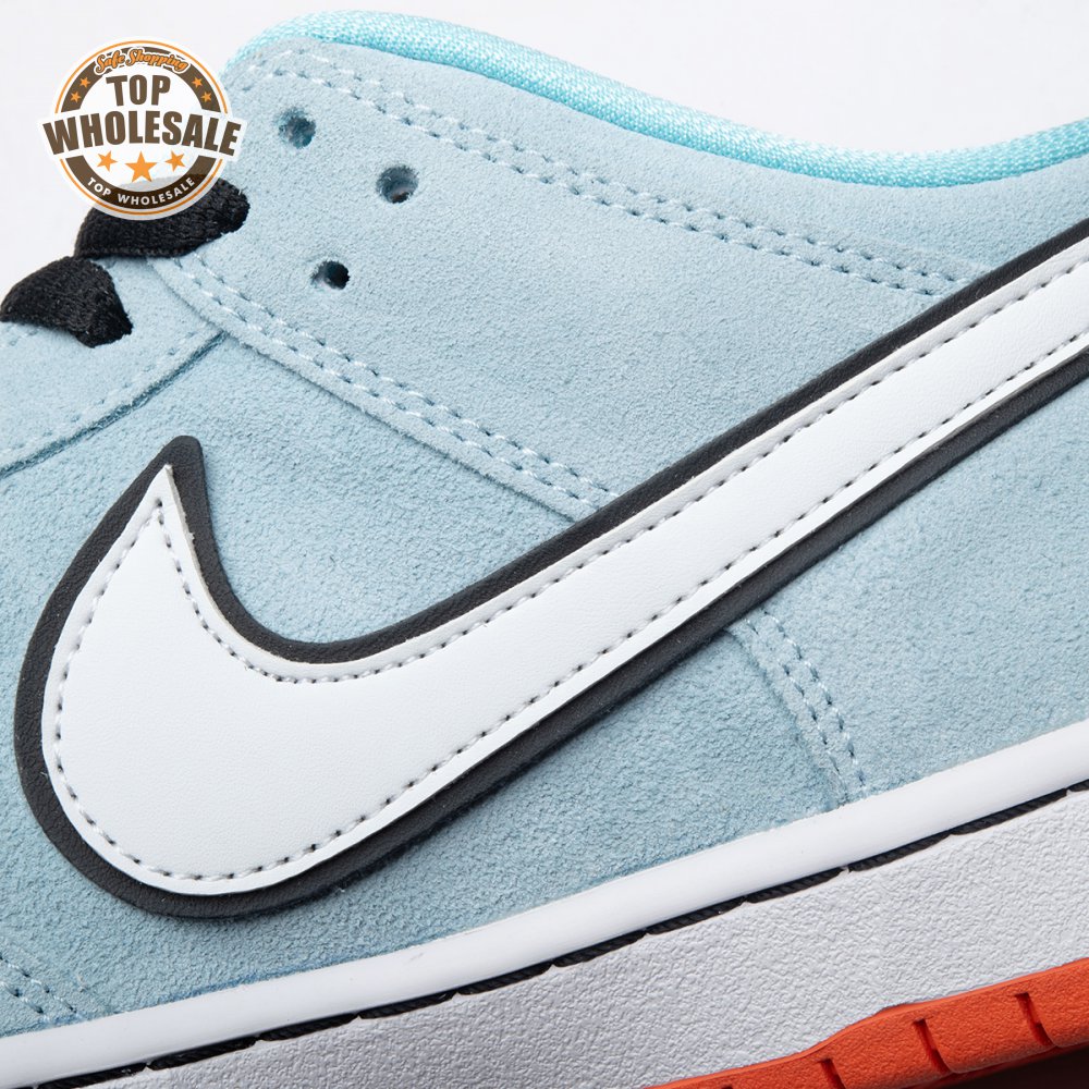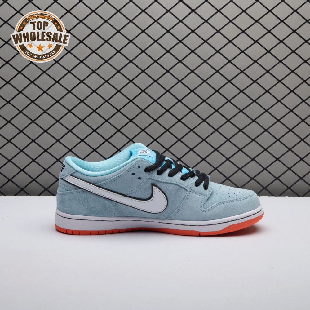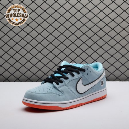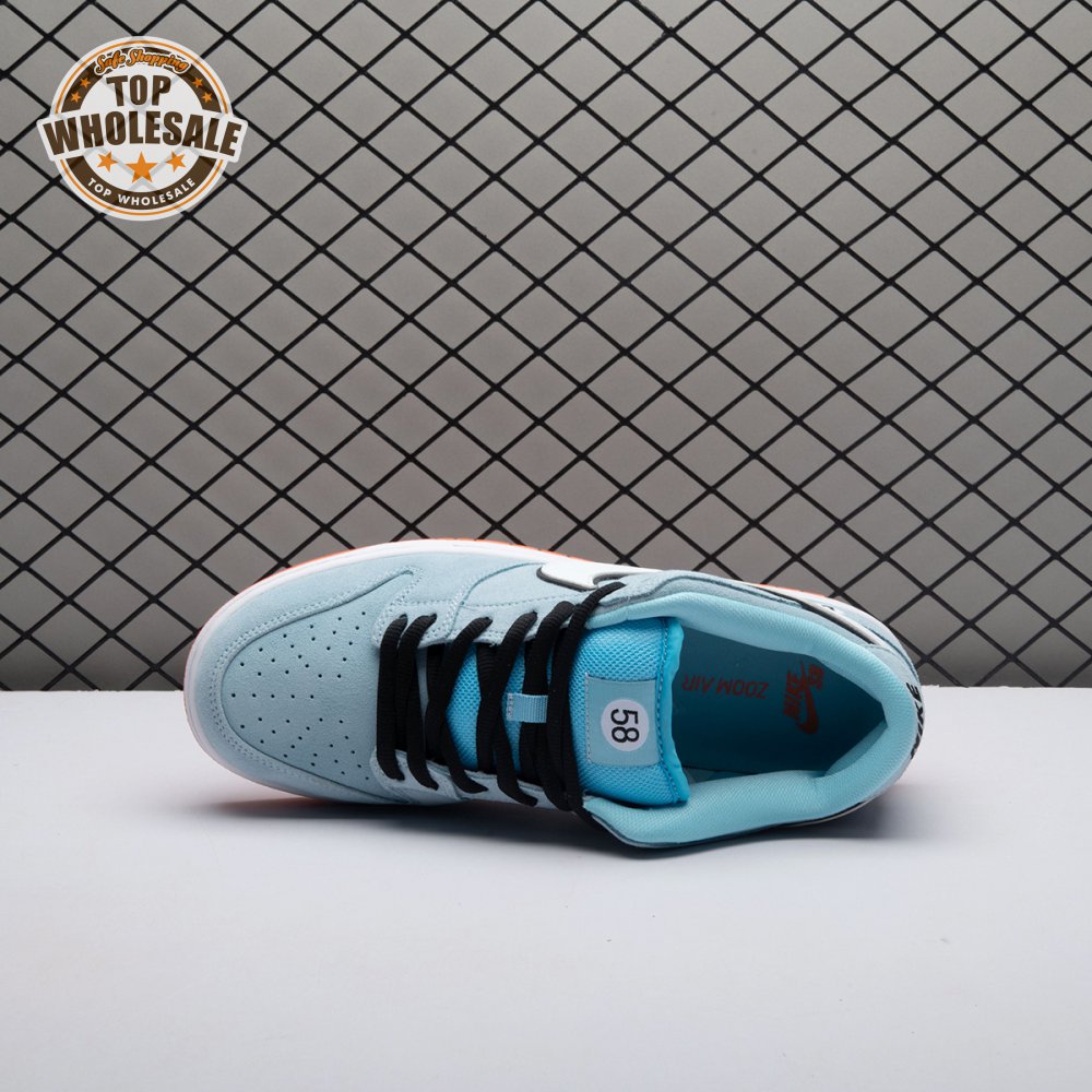 The Nike Dunk Low Pro SB 'Gulf" is the follow-up to the Blazer Mid "Club 58" from 2018, both of which are designed in collaboration with a consortium of four prominent skate shops located in Western Europe. Light blue suede is utilized throughout the upper, accented with a white leather Swoosh and a circular 58 graphic on the lateral heel. The digits are repeated on the woven tag affixed to the stuffed mesh tongue. Underfoot, a bright orange rubber outsole delivers a contrasting pop of color.