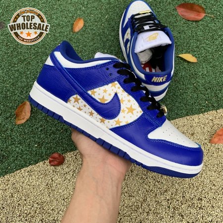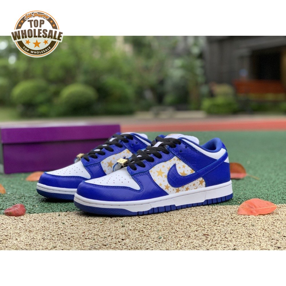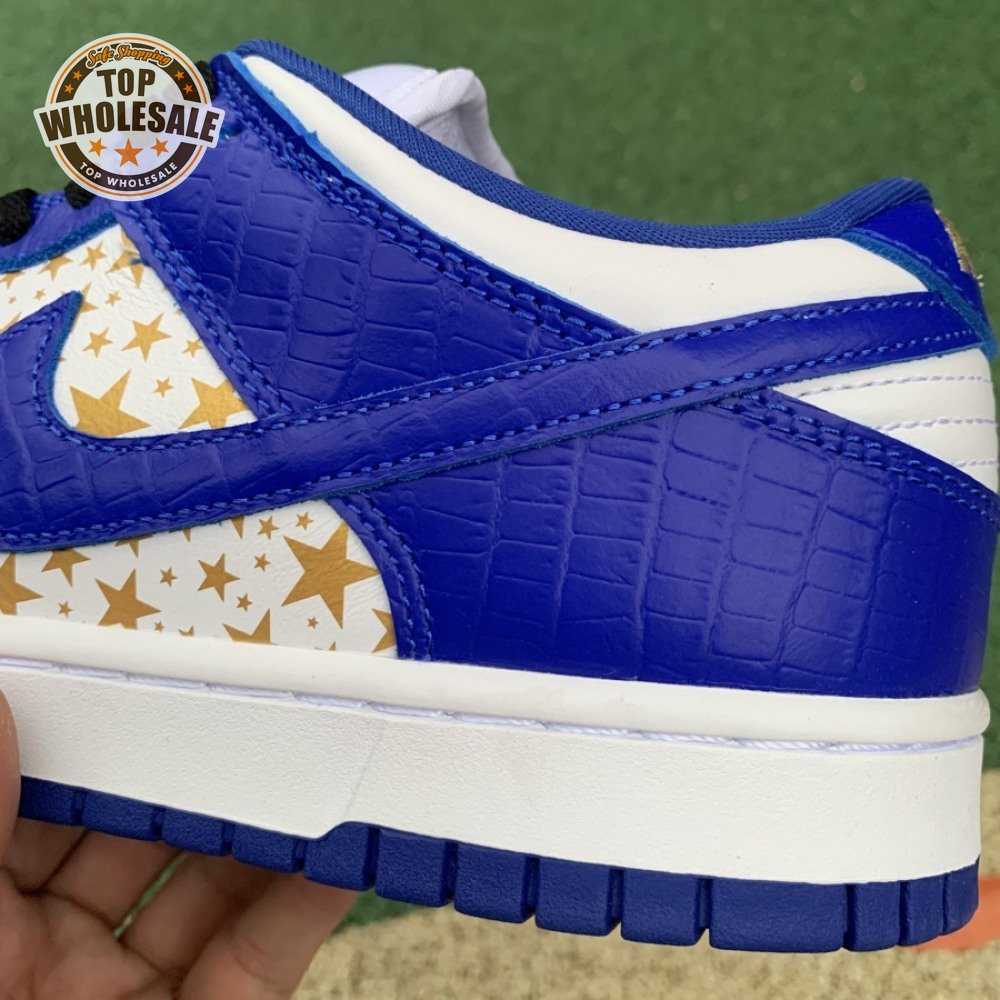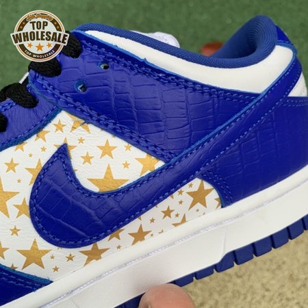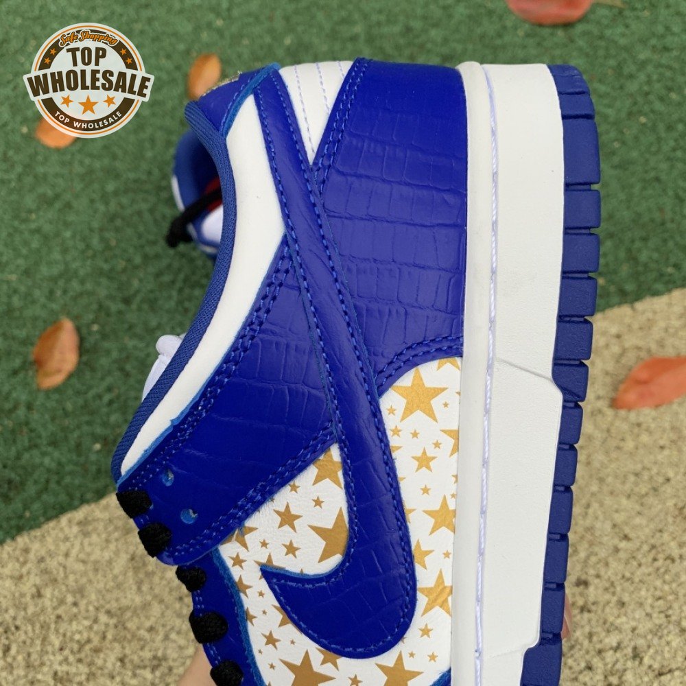 The Supreme x Nike Dunk Low OG SB QS "Hyper Royal" takes direct inspiration from the New York skate brand"s Dunk High collaboration from 2003. Like the high-top, this pair features a white leather base with metallic gold stars on the quarter panels and croc-embossed leather overlays in a contrasting hue. A standard Nike wordmark is embroidered in gold lettering on the heel tab, matching the woven tag atop the stuffed textile tongue. A gold Supreme dubrae shines at the bottom of the lace bed. Lightweight cushioning is provided by a Zoom Air-infused sockliner, its crimson surface embellished with dual Supreme and Nike SB branding.