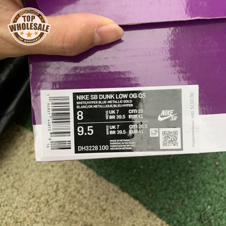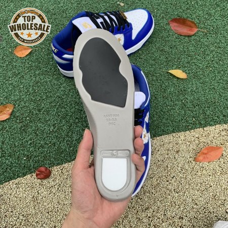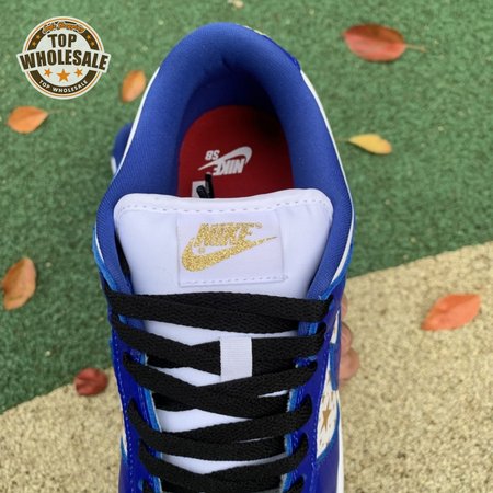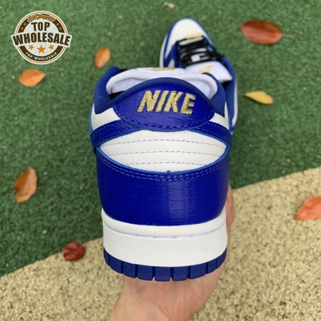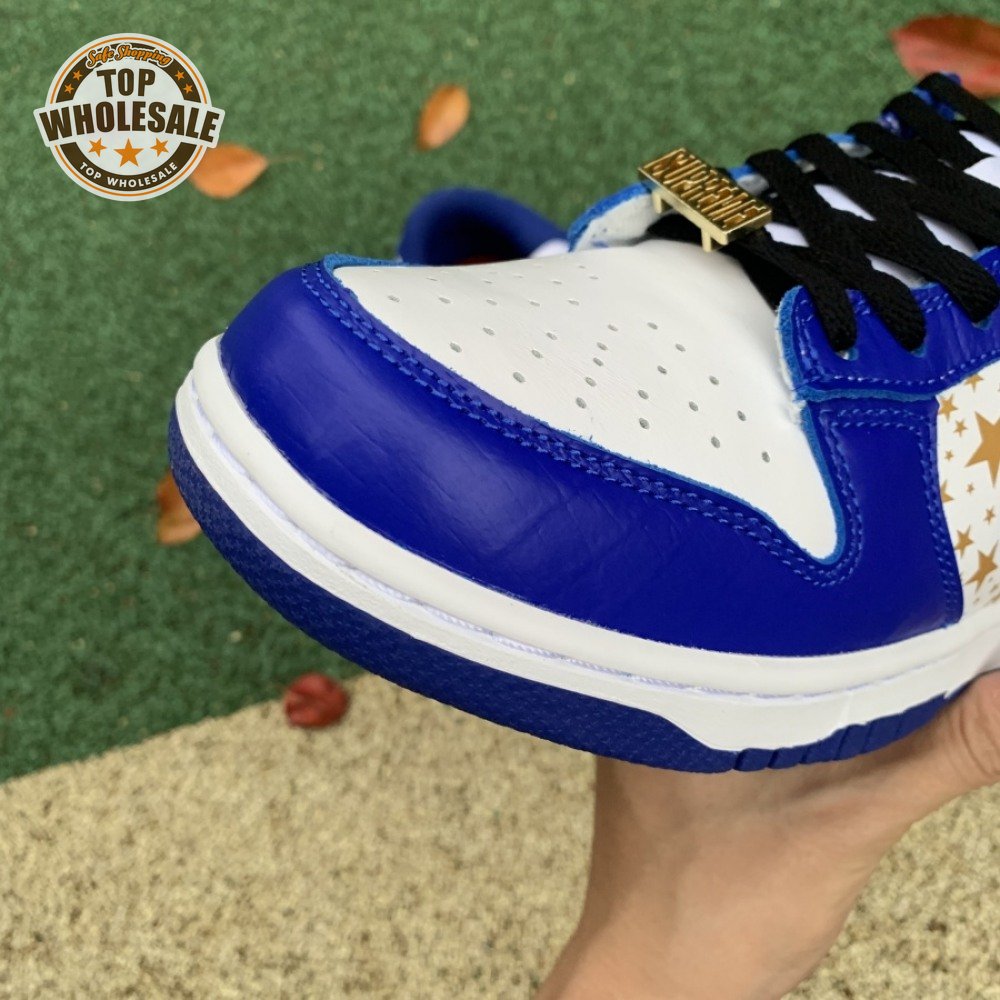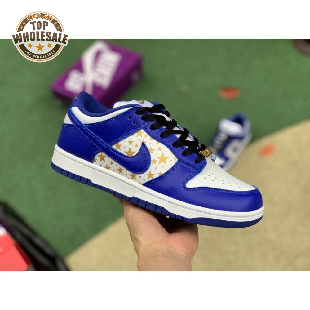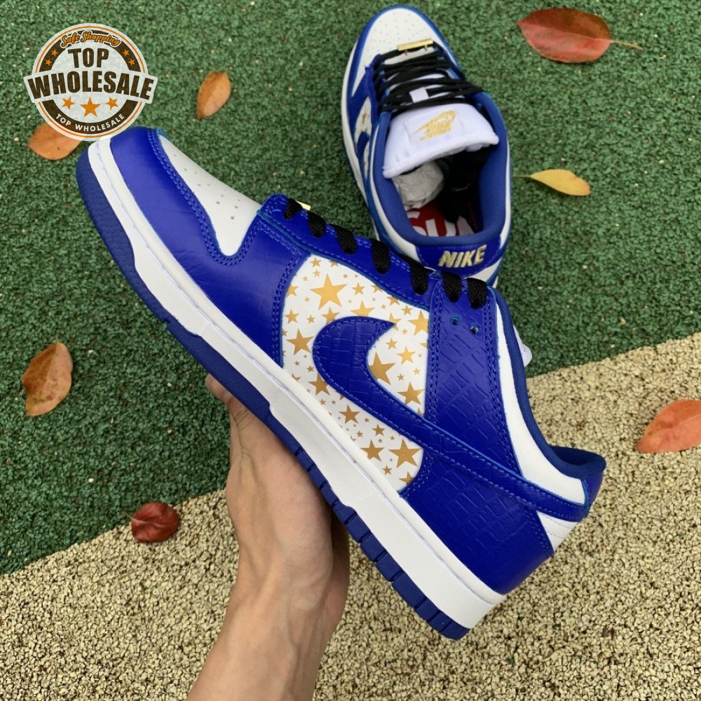 The Supreme x Nike Dunk Low OG SB QS "Hyper Royal" takes direct inspiration from the New York skate brand"s Dunk High collaboration from 2003. Like the high-top, this pair features a white leather base with metallic gold stars on the quarter panels and croc-embossed leather overlays in a contrasting hue. A standard Nike wordmark is embroidered in gold lettering on the heel tab, matching the woven tag atop the stuffed textile tongue. A gold Supreme dubrae shines at the bottom of the lace bed. Lightweight cushioning is provided by a Zoom Air-infused sockliner, its crimson surface embellished with dual Supreme and Nike SB branding.