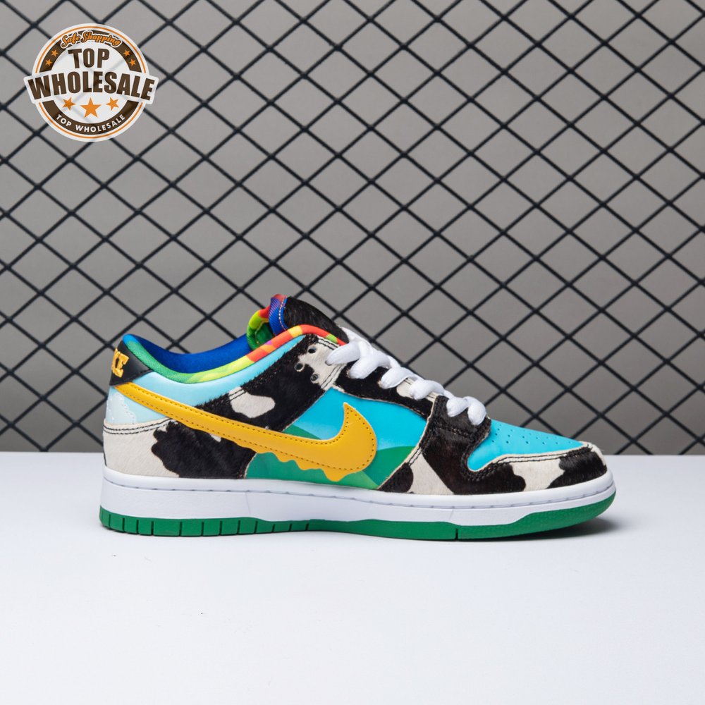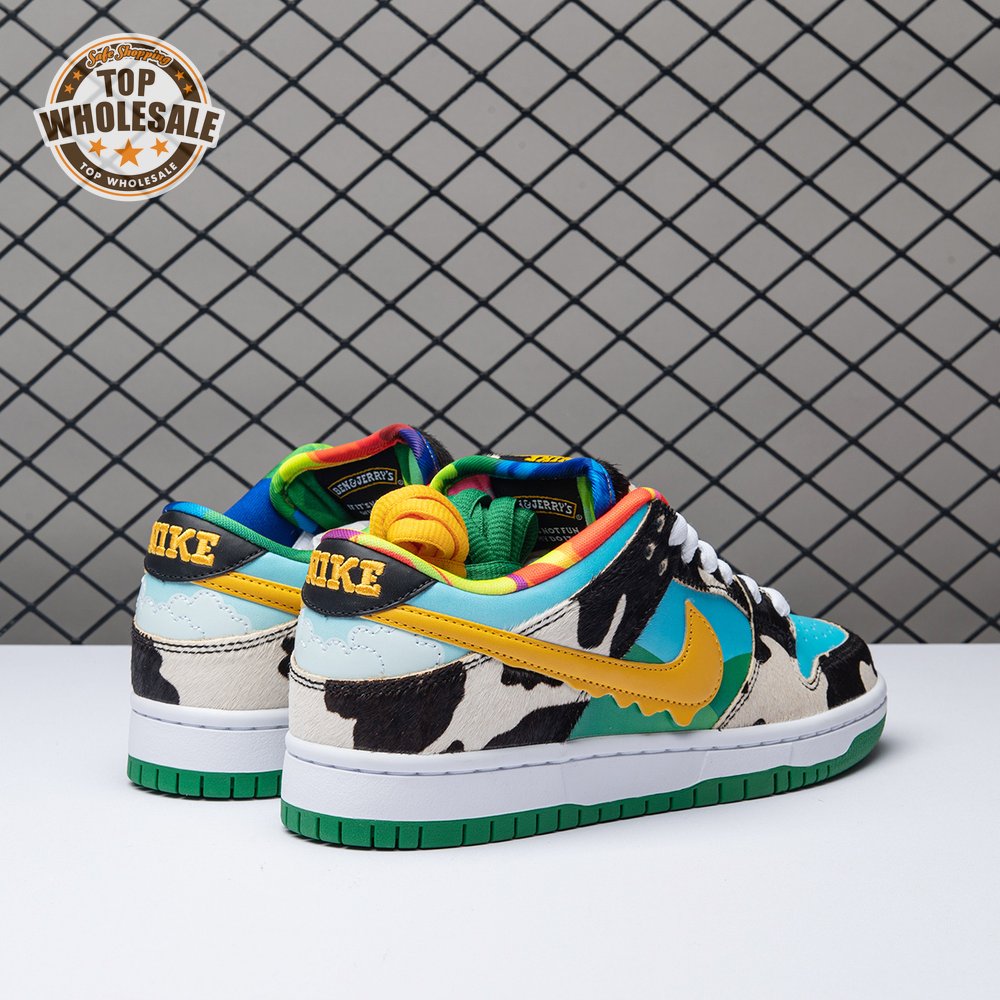 Made in collaboration with Ben & Jerry"s, the Nike Dunk Low SB "Chunky Dunky" replicates the packaging used for the ice cream brand"s Chunky Monkey flavor. The leather upper depicts blue skies and green pastures, while pony-hair overlays are rendered in a spotted cow print. A yellow leather Swoosh is treated to a melting ice cream effect for added visual flair. Atop the tongue, the woven tag features a Chunky Dunky callout alongside Nike SB branding.