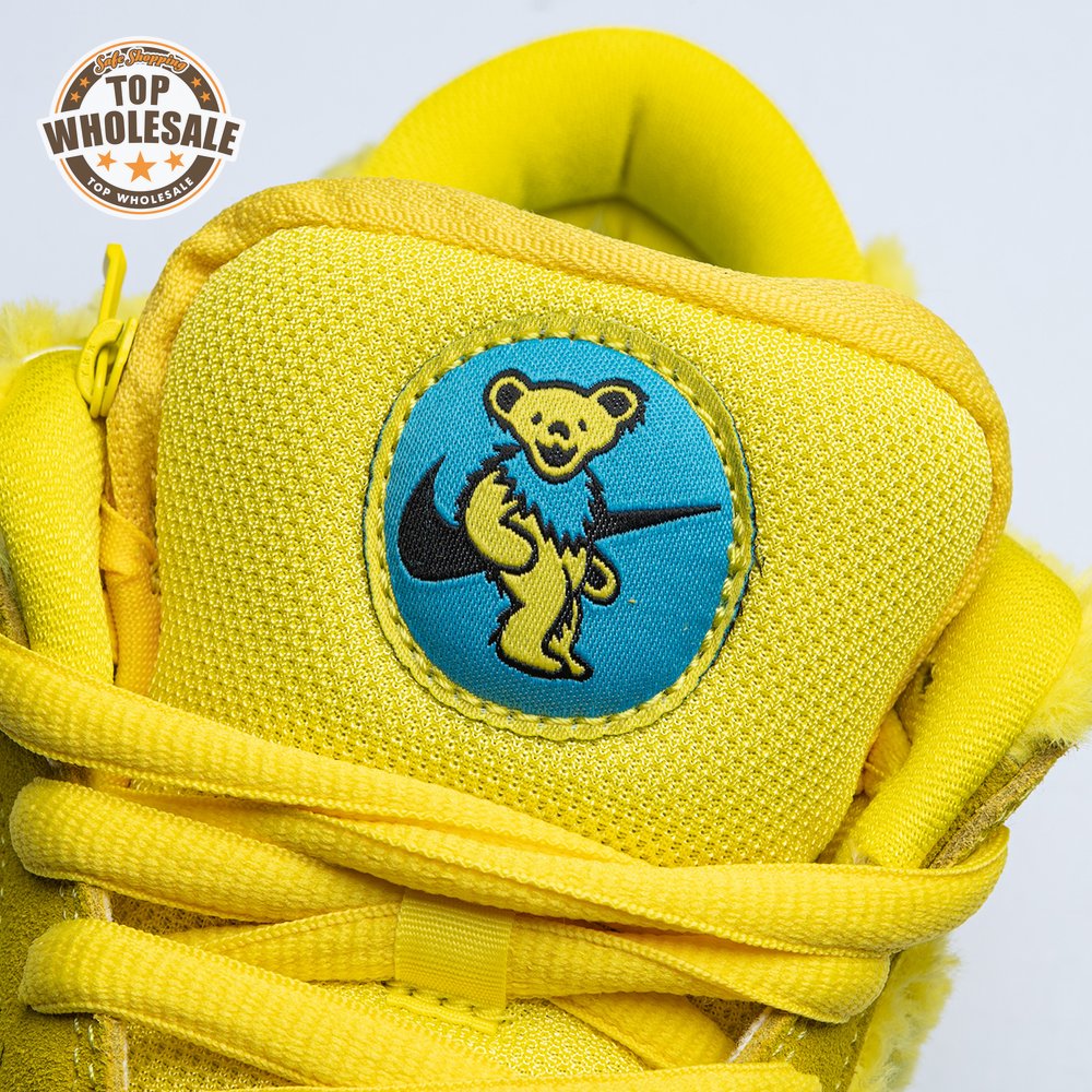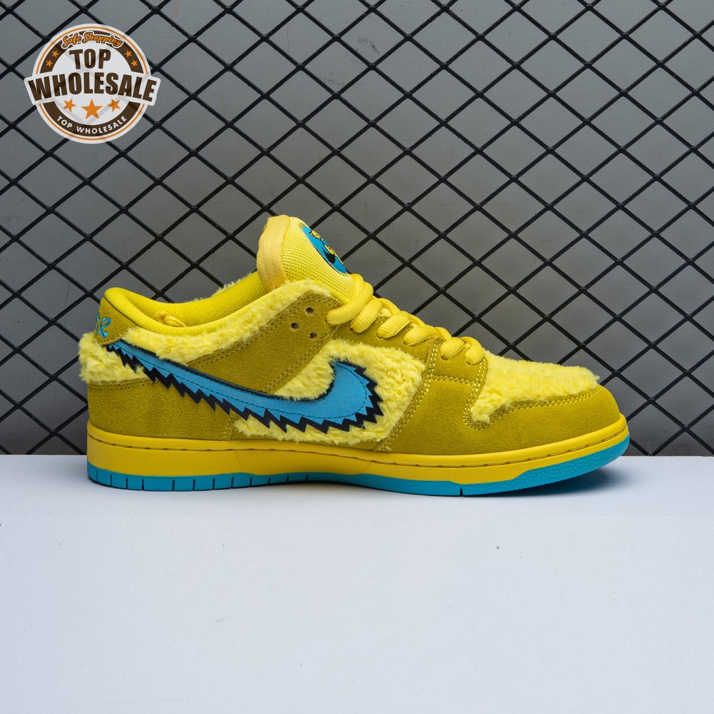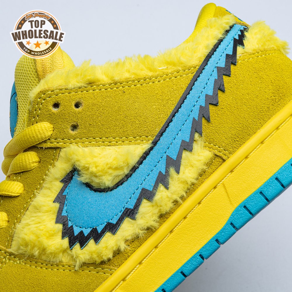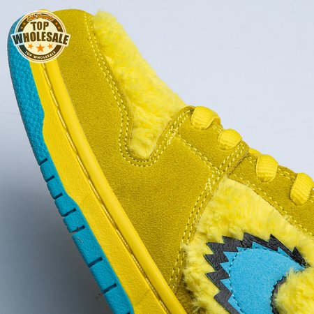 Developed in collaboration with the iconic San Francisco jam band, the Grateful Dead x Nike Dunk Low SB "Yellow Bear" features a unique design inspired by the back cover of "History of the Grateful Dead, Volume One (Bear"s Choice)," a live album originally released in 1973. A vibrant yellow finish is applied to the furry upper, fortified with tonal suede overlays and mounted atop a matching yellow foam midsole. Contrasting blue hits appear on the jagged Swoosh, rubber outsole and tongue, the latter furnished with a hidden stash pocket.