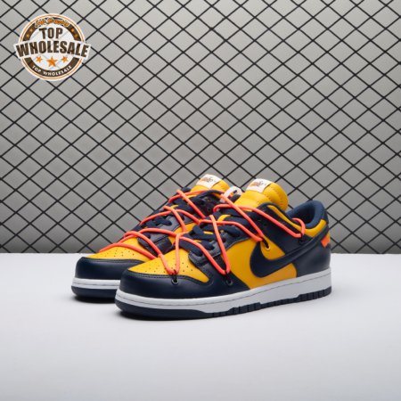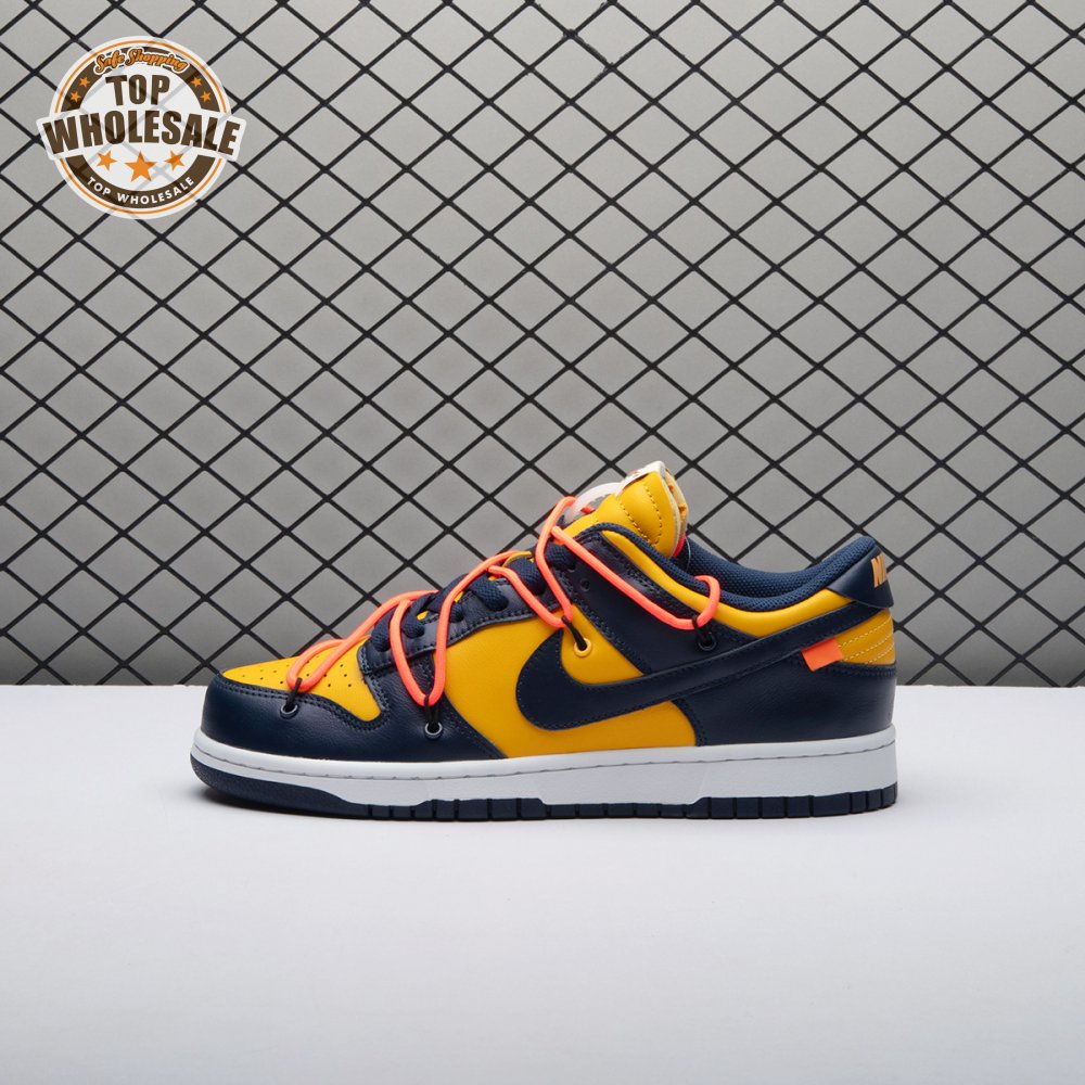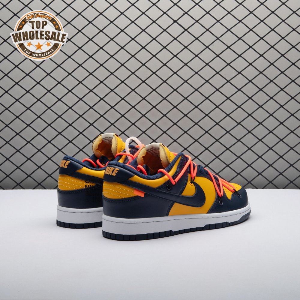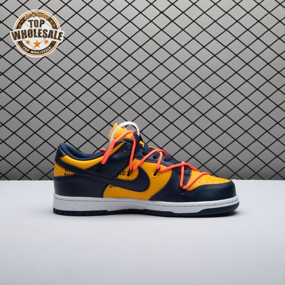 Arrived in December 2019, Off-White and Nike continue their creative partnership by revisiting the Dunk Low for a three-piece capsule. This edition in University Gold and navy leather sports a signature orange flag label on the lateral Swoosh. Virgil Abloh's deconstructed style is exhibited in the form of secondary Flywire lacing, exposed tongue foam and enlarged branding on the medial. The sneaker's split-colored rubber cupsole remains.