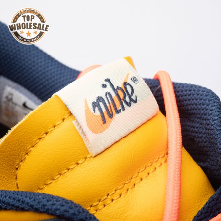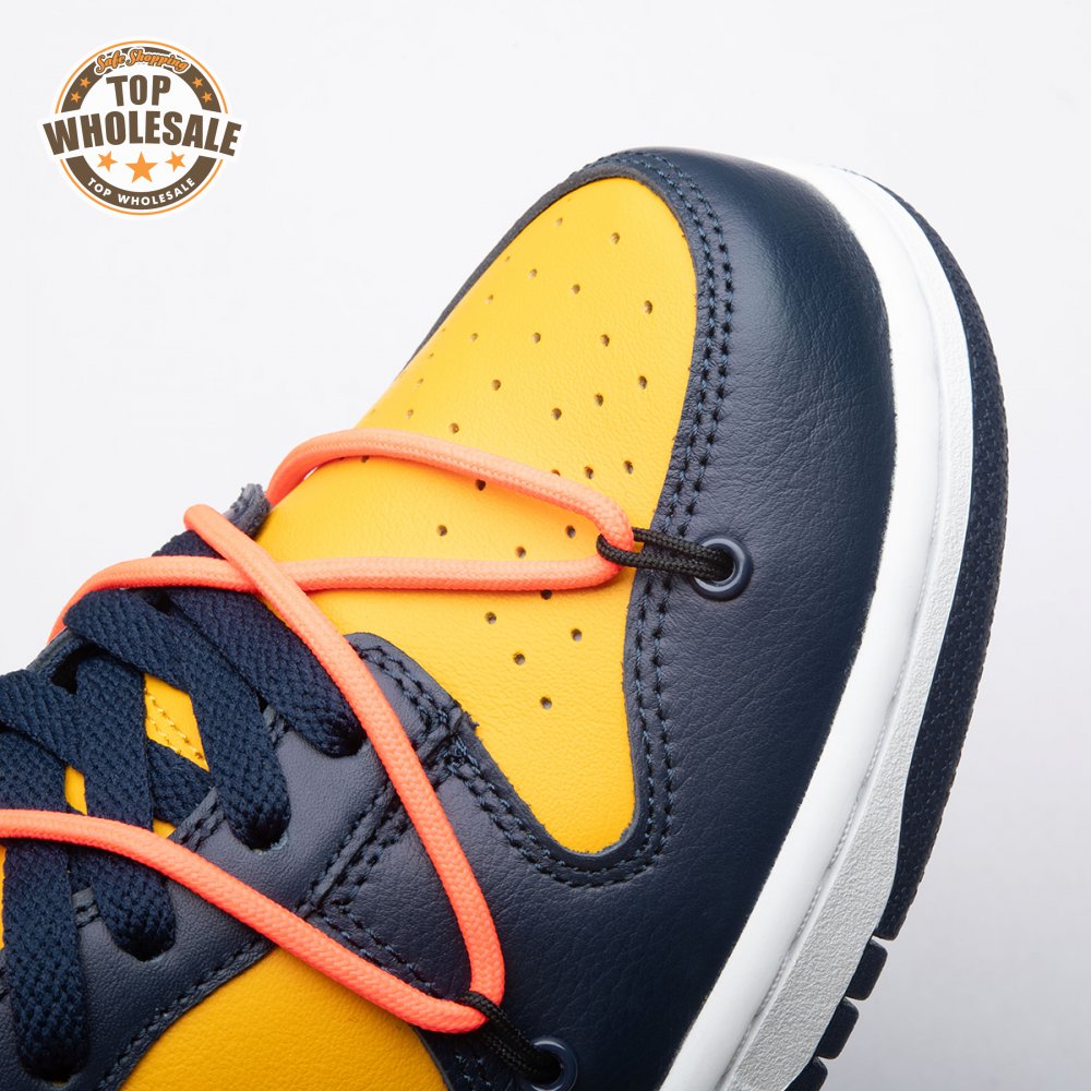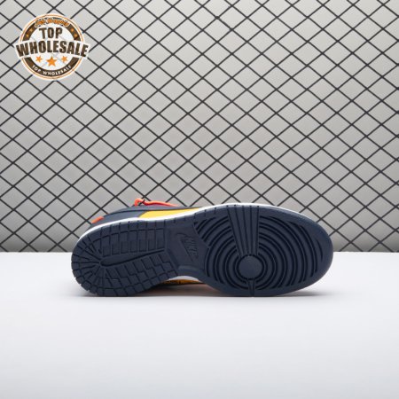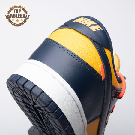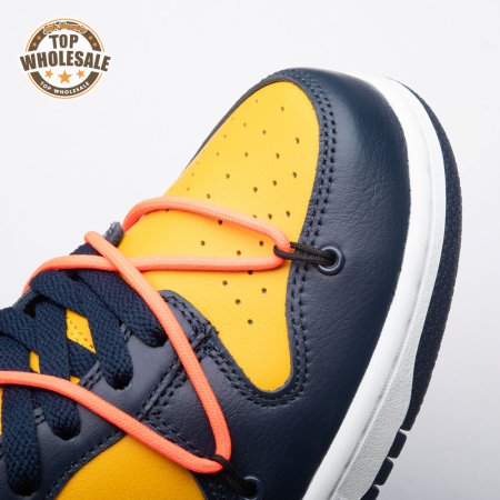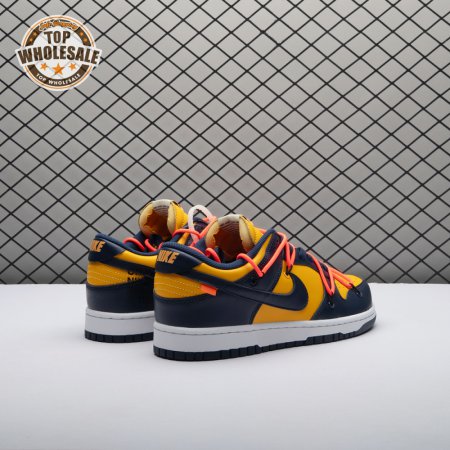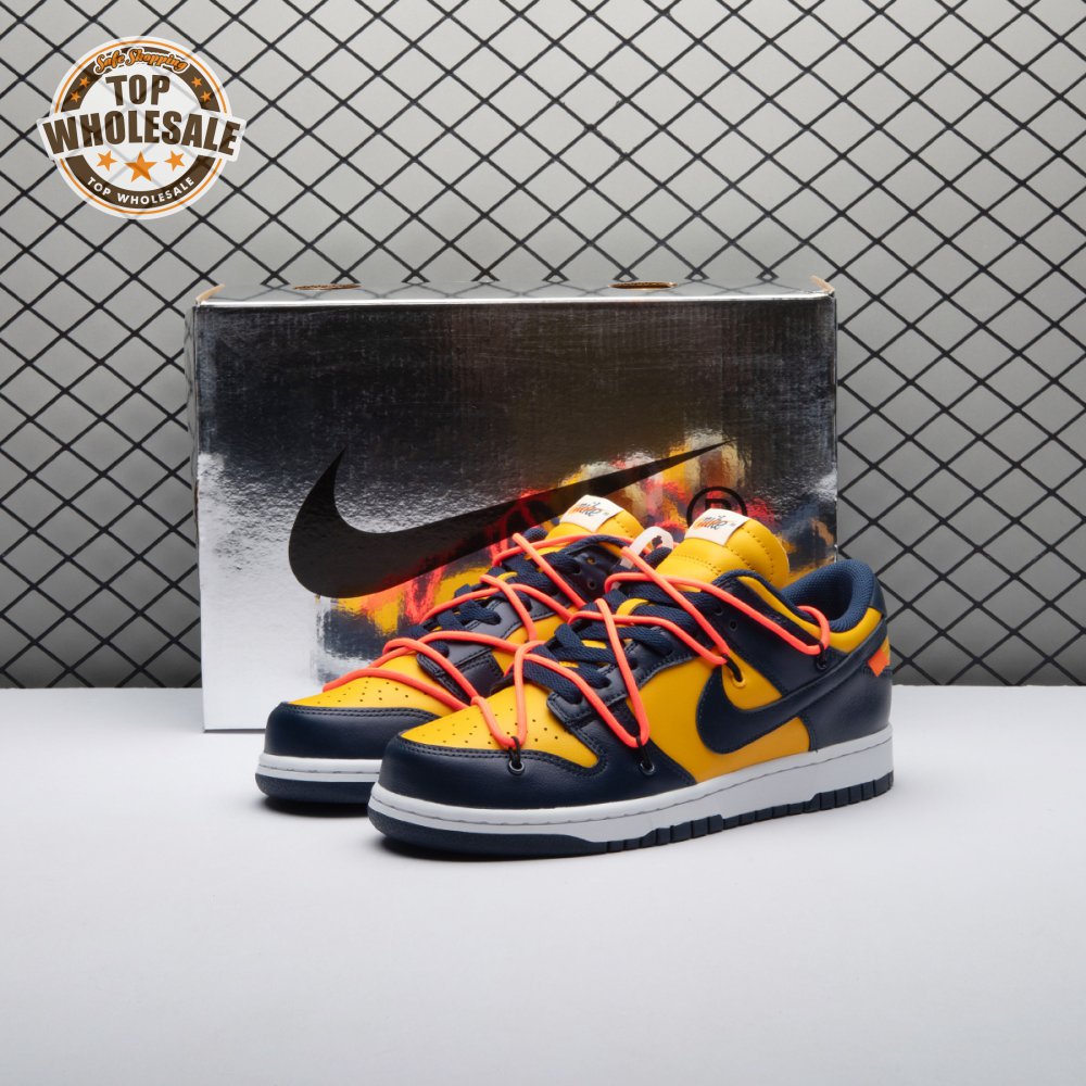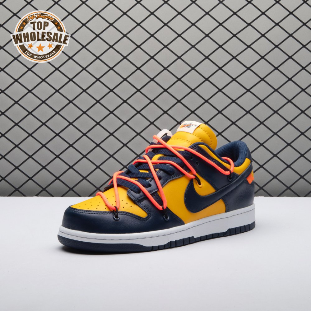 Arrived in December 2019, Off-White and Nike continue their creative partnership by revisiting the Dunk Low for a three-piece capsule. This edition in University Gold and navy leather sports a signature orange flag label on the lateral Swoosh. Virgil Abloh's deconstructed style is exhibited in the form of secondary Flywire lacing, exposed tongue foam and enlarged branding on the medial. The sneaker's split-colored rubber cupsole remains.
