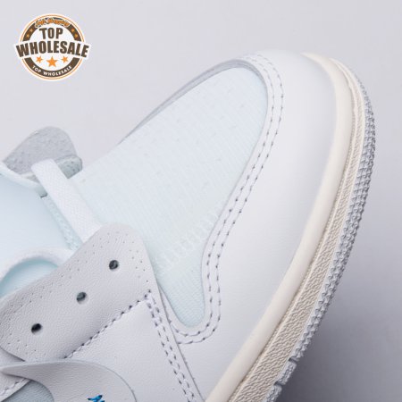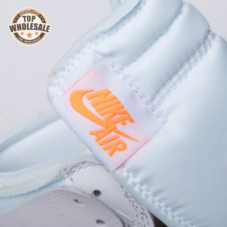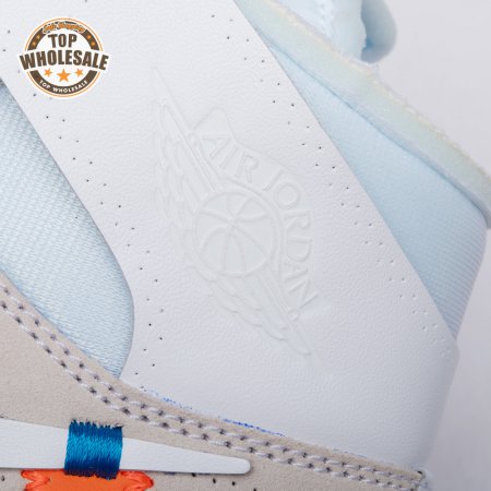 The Off-White x Air Jordan 1 Retro High OG BG 'White' 2018 features an allover white premium leather and mesh upper, with deconstructed Swoosh branding, Wings logos on the ankles, "AIR" lettering on the midsole, branded text on the side panels, and orange tabs. This kids model is a reimagination of the "Chicago" themed Jordan 1.