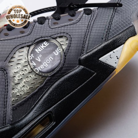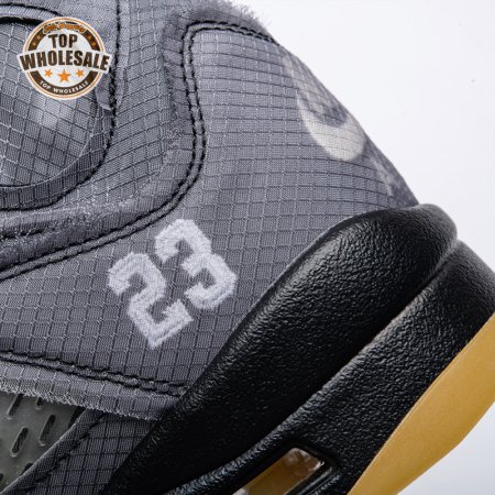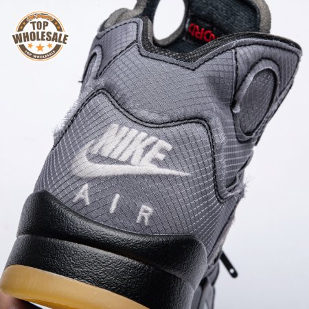 The Off-White x Air Jordan 5 SP 'Muslin' delivers Virgil Abloh"s stylized take on the retro silhouette. The faded black textile upper blends traditional details, including a silver reflective tongue and embroidered Nike Air branding, with Virgil"s signature text on the laces and medial-side quarter panel. A pre-yellowed translucent rubber outsole adds to the sneaker"s vintage aesthetic.