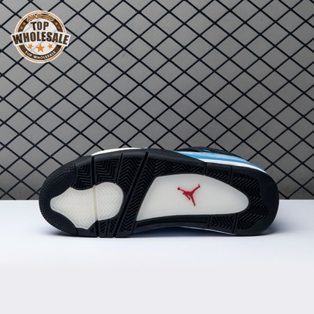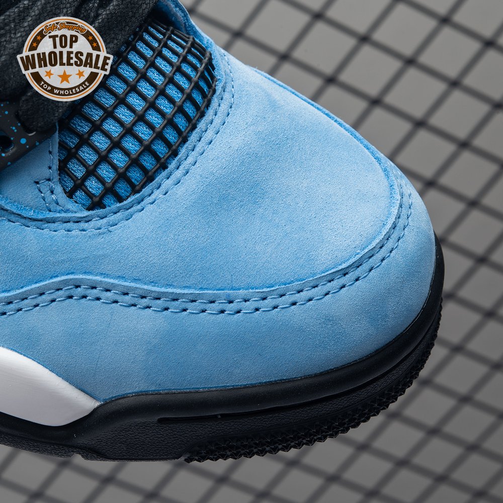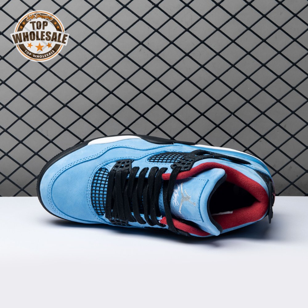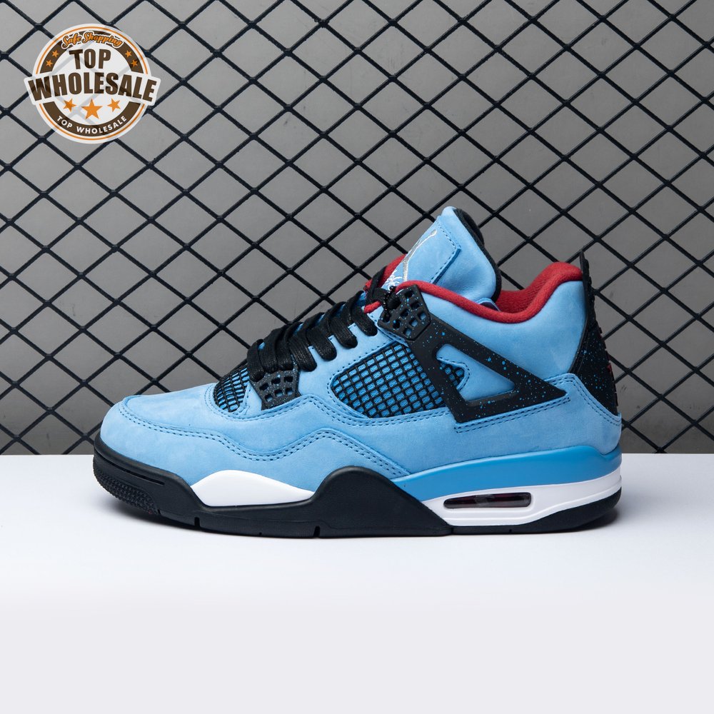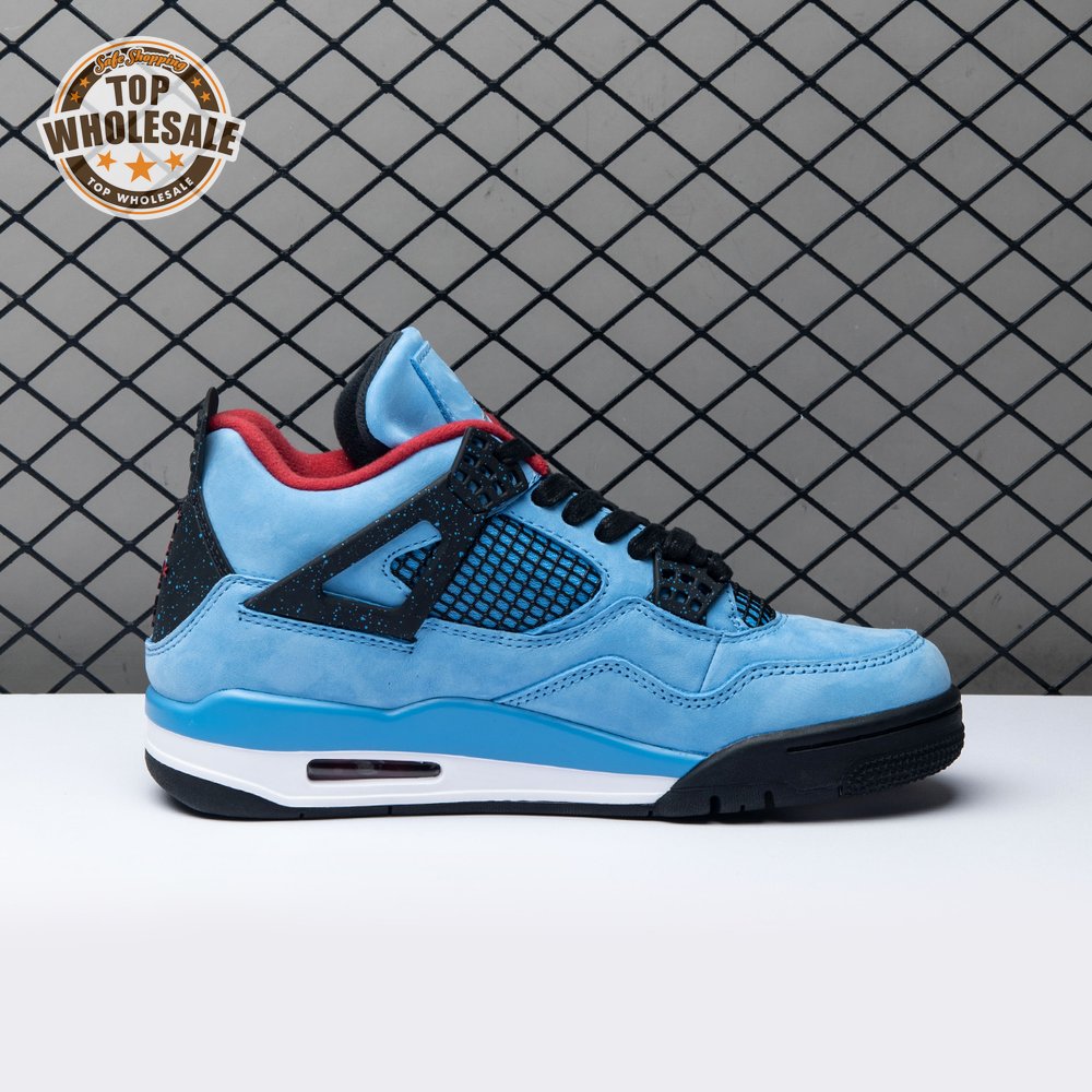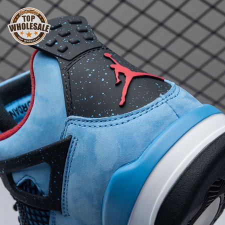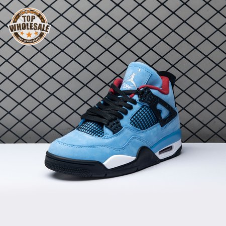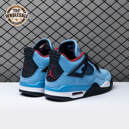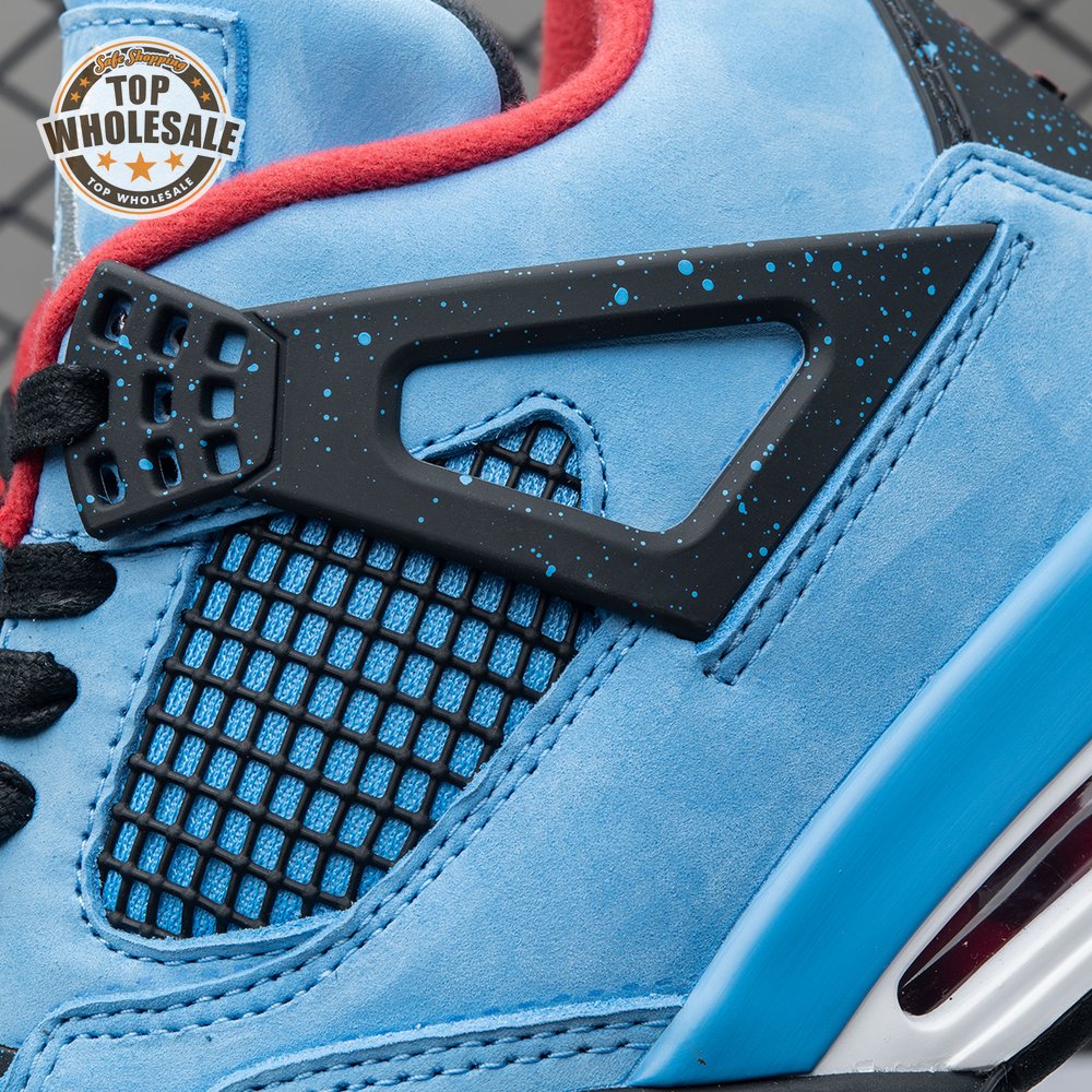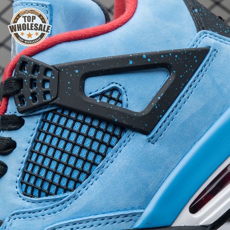Music artist Travis Scott hails from Houston, where the Oilers used to take the field in red, white and blue uniforms. The Travis Scott x Air Jordan 4 Retro 'Cactus Jack' colorway pays tribute to the city"s bygone football team with a Durabuck leather upper dressed in University Blue and a Varsity Red insole. The black lace cage and a heel panel feature a light blue speckle pattern. Cactus Jack branding appears on the left heel in Varsity Red, with a matching Jumpman logo on the right.