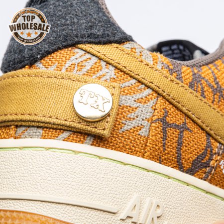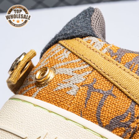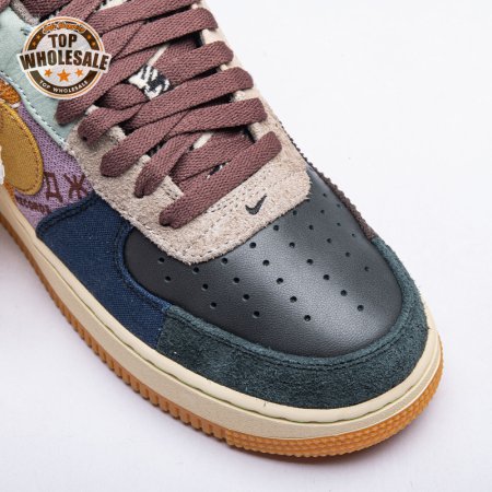 The Travis Scott x Air Force 1 Low 'Cactus Jack' is a unique creation featuring the rapper's trademark utilitarian cues. Released in November 2019, this edition has printed canvas, leather and suede uppers with zipped corduroy lace shrouds and different colored Swooshes on the sides. The sneaker rests atop a classic AF1 midsole and gum rubber outsole.
